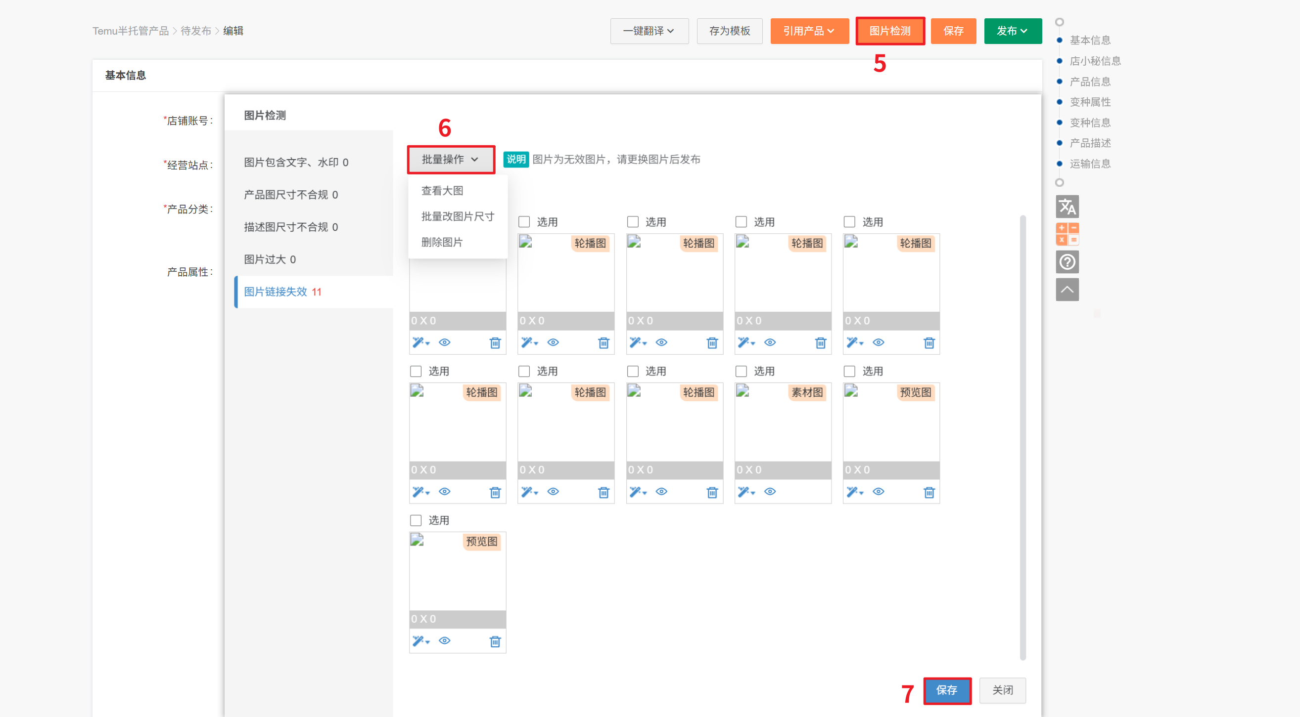比如轮播图、颜色图、描述图等,只要不符合规范就能被检测出来,方便批量修改大小/删除后再发布