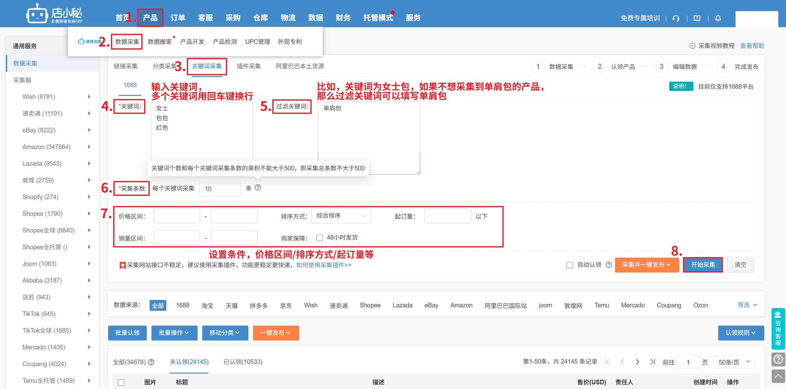 【产品—数据采集—关键词采集—输入关键词、过滤关键词、采集条数—设置条件、价格销量、排序方式等—开始采集】