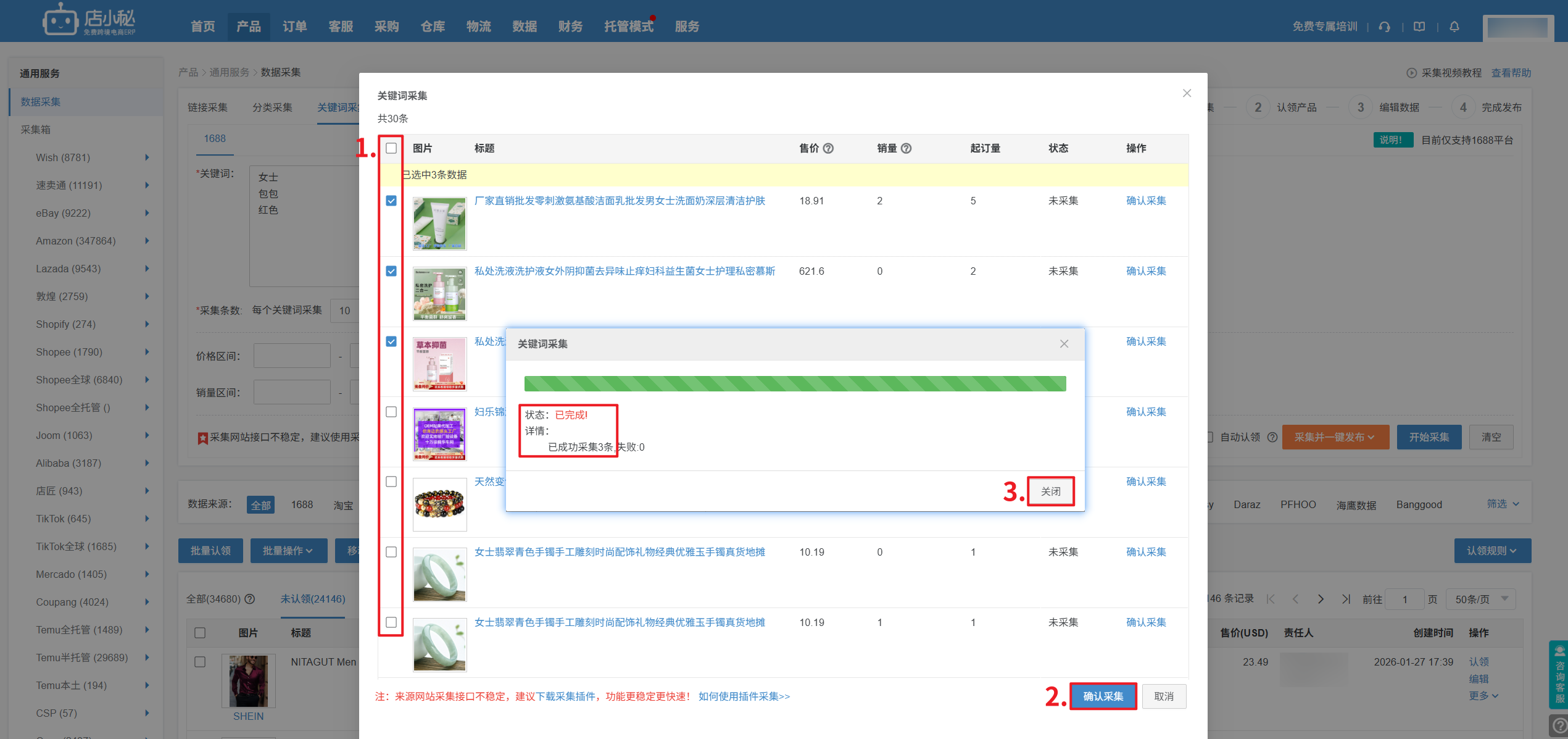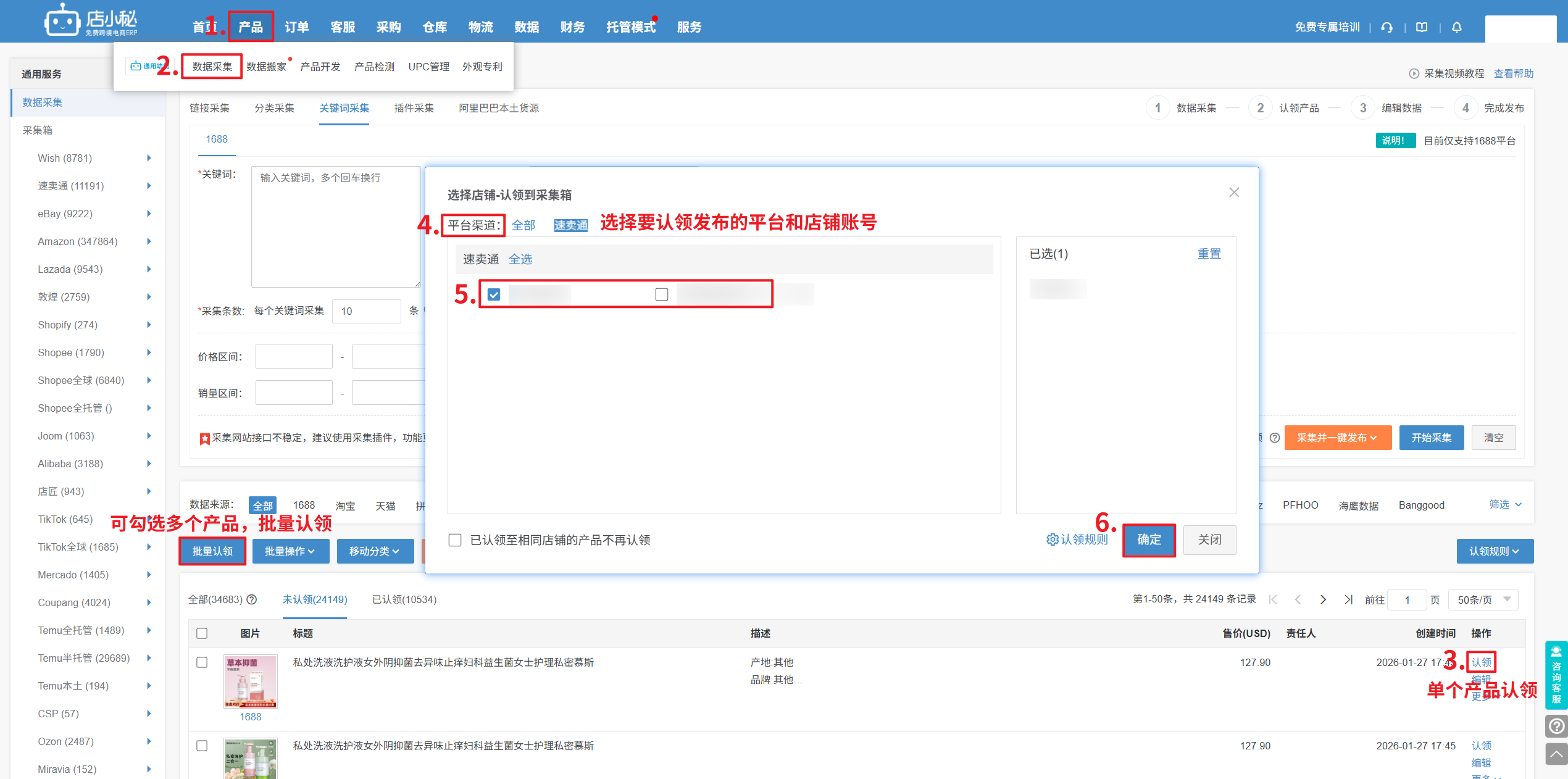 第四步:【采集成功后—打开小秘产品页面—数据采集—查看采集到的产品信息—单个/批量认领到自己的平台店铺—确定】