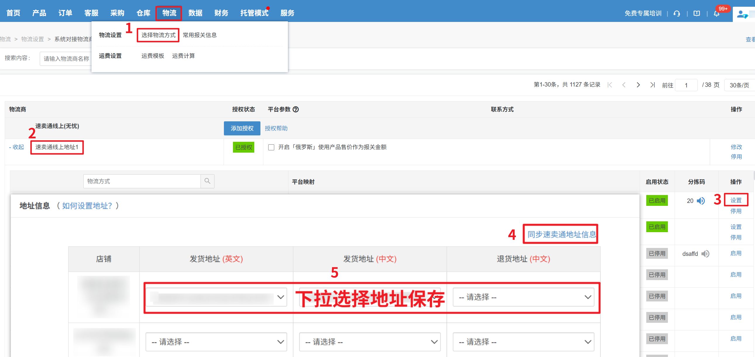 第三步:【针对速卖通线上地址1,点展开—启用对应仓库物流渠道—同步速卖通地址信息,选择发货地址1、退货地址1,保存】