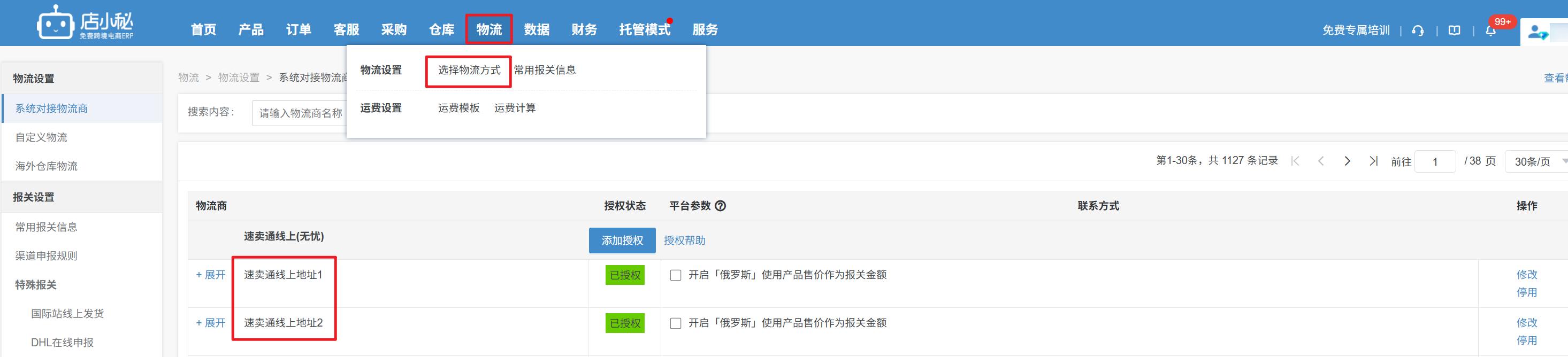 第二步:【小秘页面,物流—选择物流方式—授权2次速卖通线上,分别定义名字为速卖通线上地址1和速卖通线上地址2】