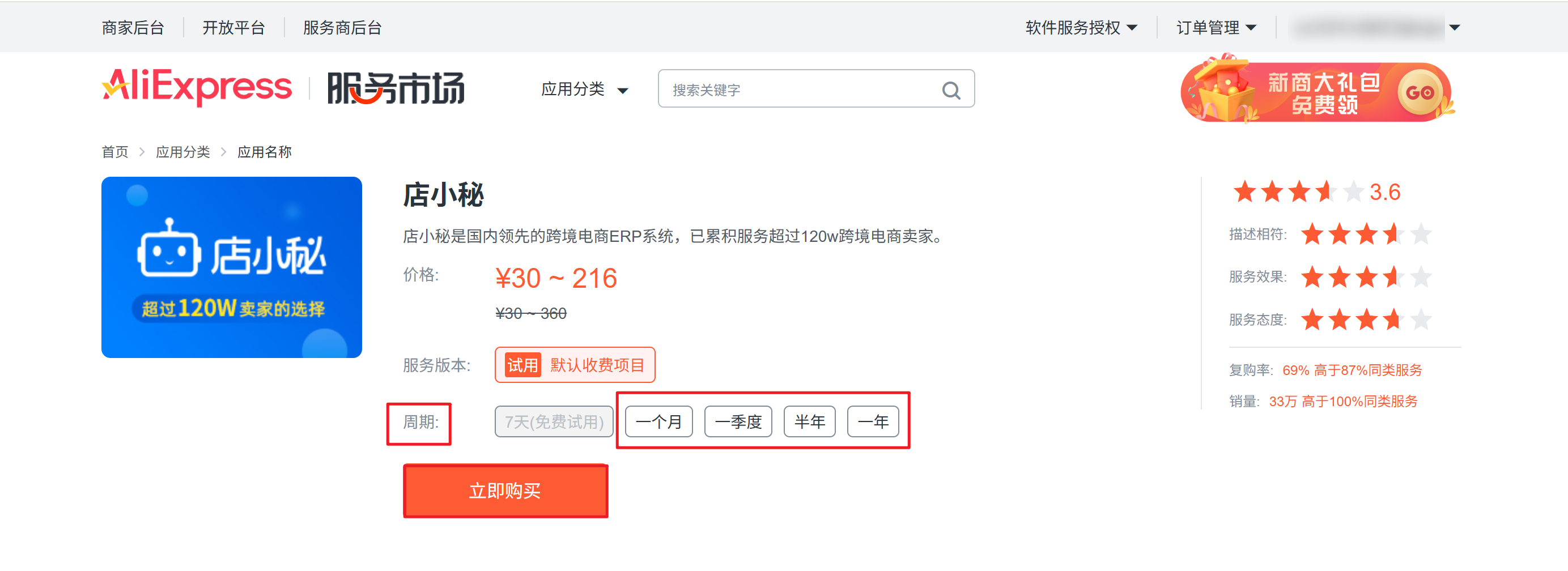 购买30元/月 216/年的 速卖通市场服务后,需要再开通小秘VIP(最低VIP1 198/月 2016/年)的服务