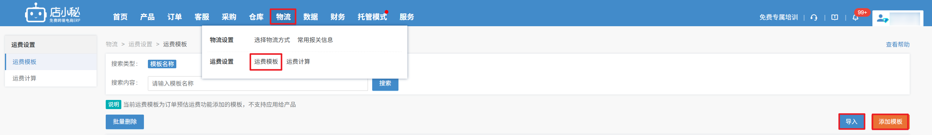 2、小秘预估运费的运费模板,是到小秘页面【物流-运费模板】下,根据不同物流渠道报价表分别创建运费模板