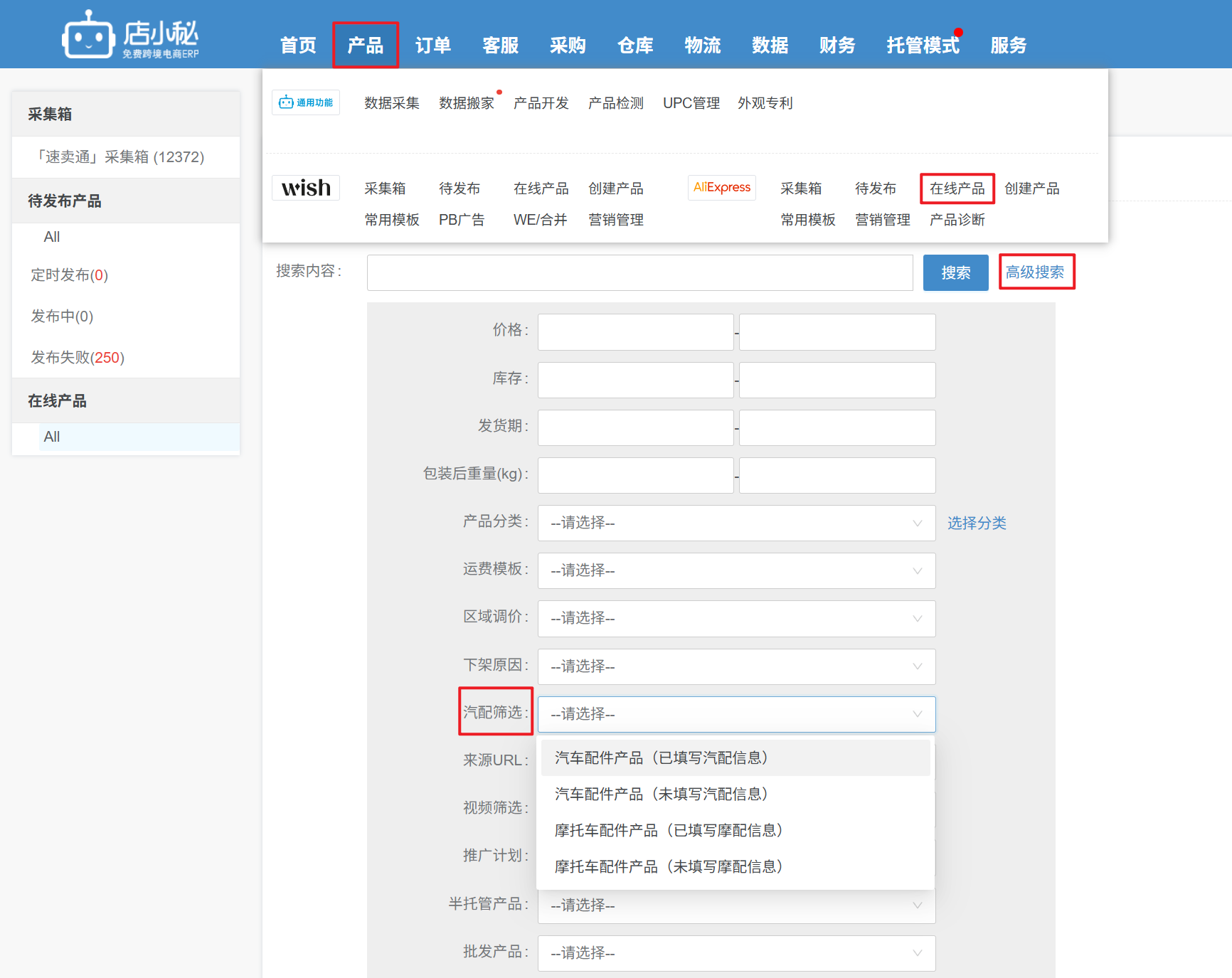 【产品—在线产品—选择店铺—高级搜索—汽配筛选条件—搜索】
