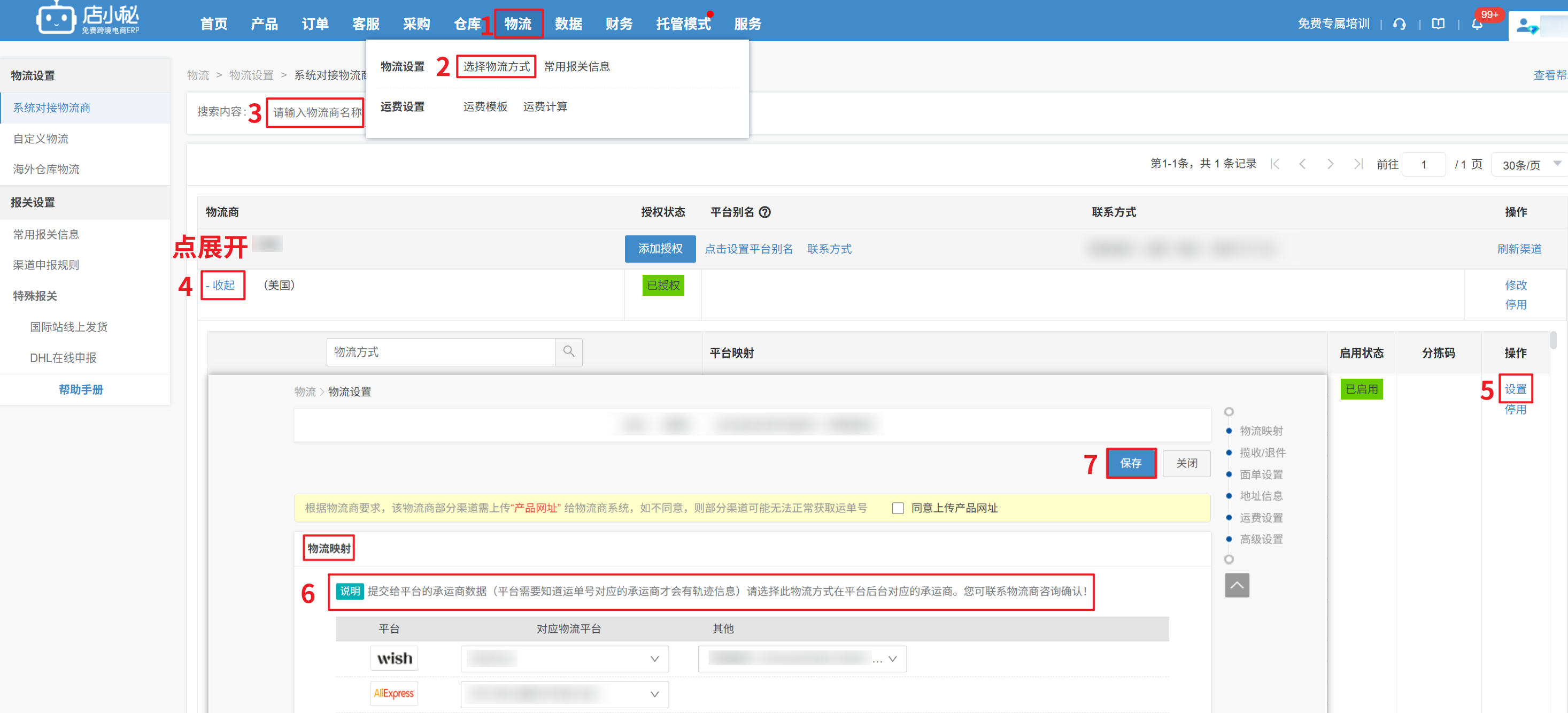 第二步:若支持,在小秘页面【物流—选择物流方式—找到订单选择的物流渠道—设置—和物流商核实平台映射,修正保存】