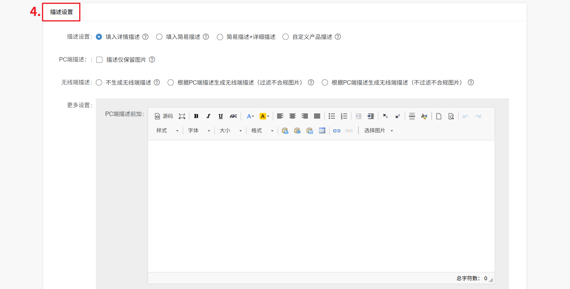 更多设置:可设置在PC端描述前/后,添加固定图片/文字内容,删除指定内容
