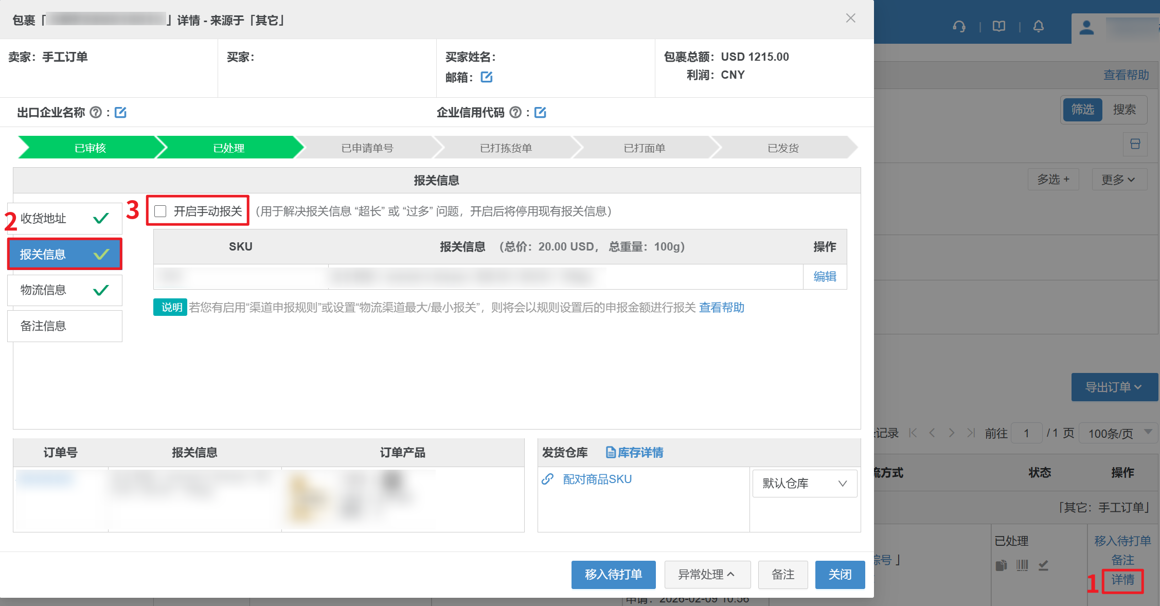 1、【订单详情—报关信息—勾选开启手动报关—完善报关信息后,重新申请】