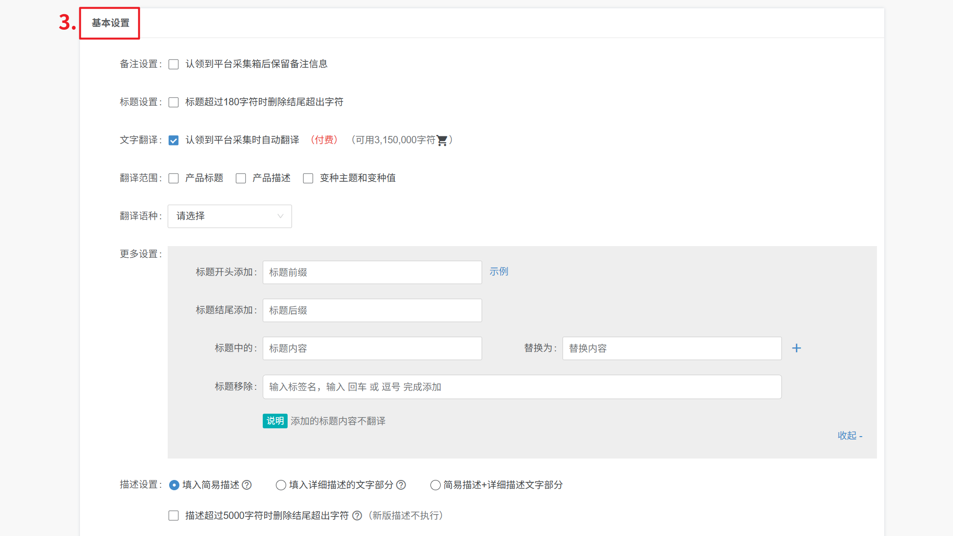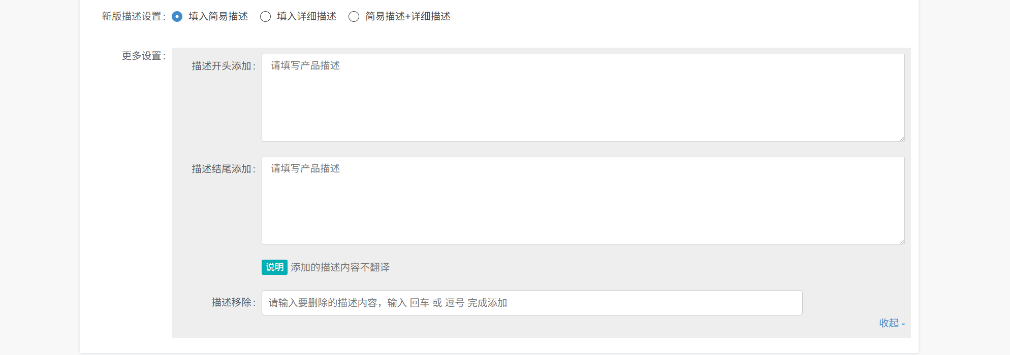 更多设置:对描述内容开头或者结尾添加固定内容或者删除描述中具体词汇
