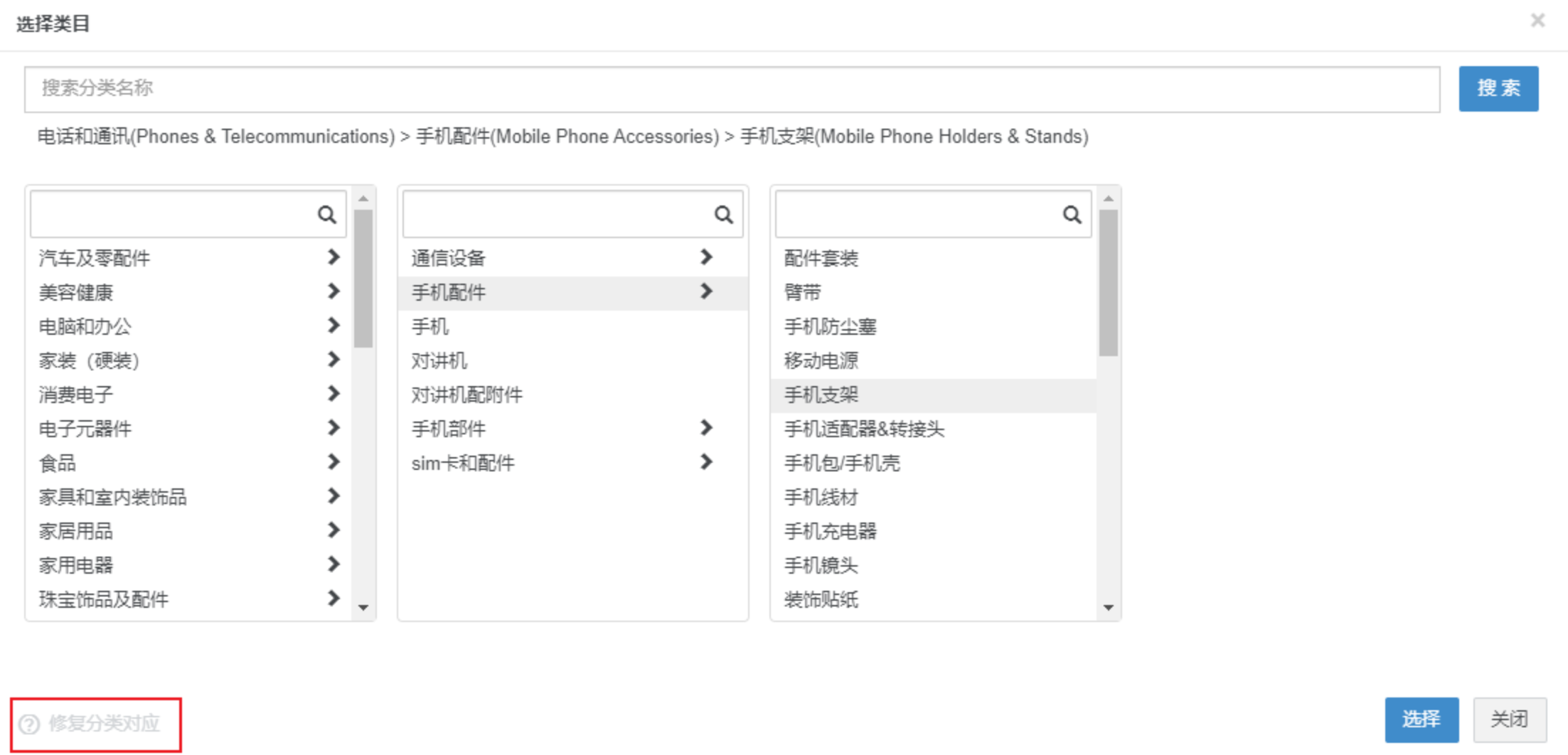 定义:若采集认领到速卖通采集箱编辑产品时,分类自动对应错误或手动编辑分类错误,可先解绑后重选分类注意事项:【1】解绑过的产品不能再次解绑【2】产品在采集箱状态才能操作操作流程:【产品—速卖通平台采集箱—编辑—选择分类—修复对应分类—解绑—重新选择分类】常见问题:Q1:为什么“修复分类对应”按钮是灰色,无法点击?A1:1、需要产品在采集箱状态才可以操作 2、解绑过的产品无法再次解绑