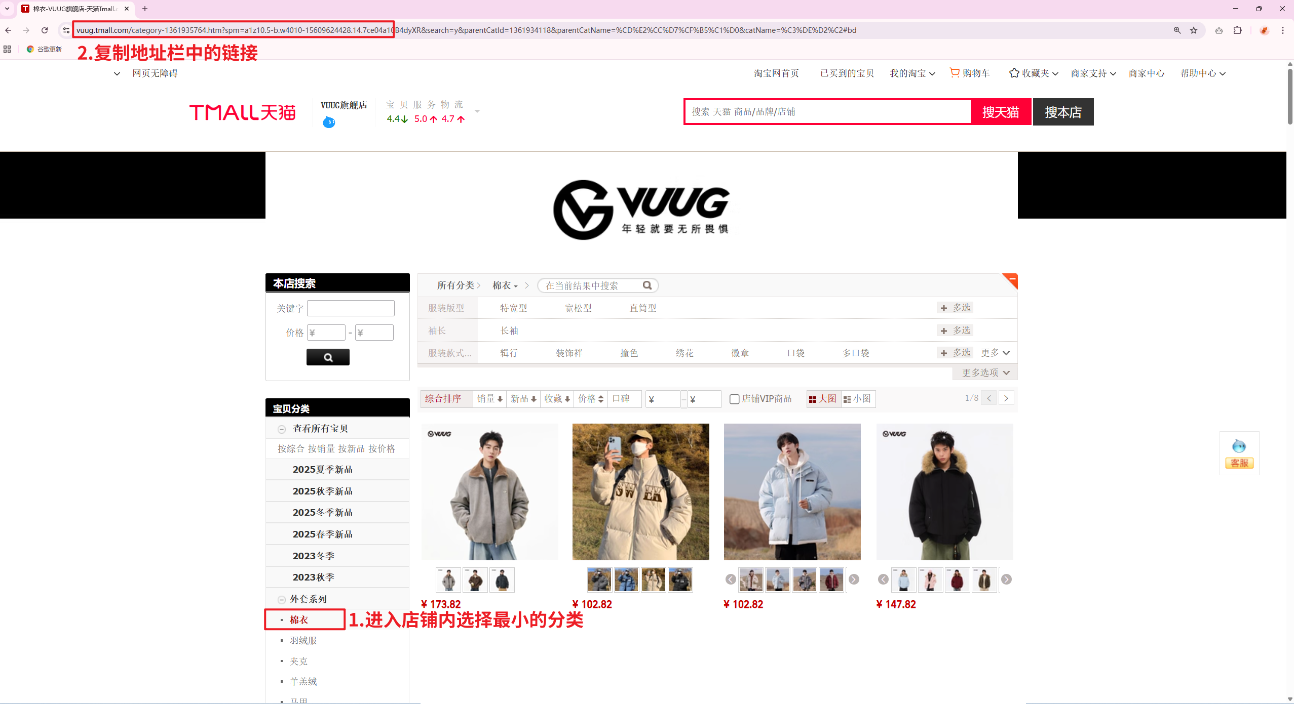 第一步:【进入店铺内的最小分类页面—复制地址栏链接—返回小秘产品页面—数据采集—分类采集—粘贴网址—开始采集】