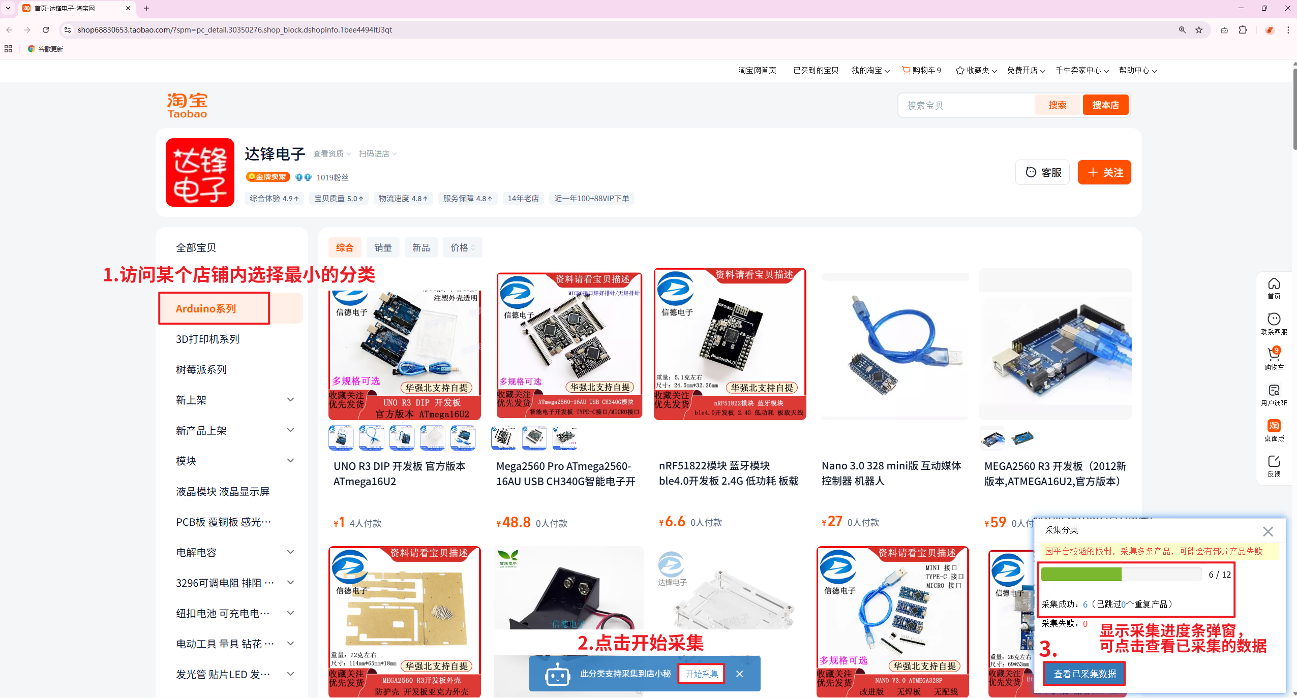 方式一:通过采集插件,访问店铺内最小分类链接,底部点击开始采集