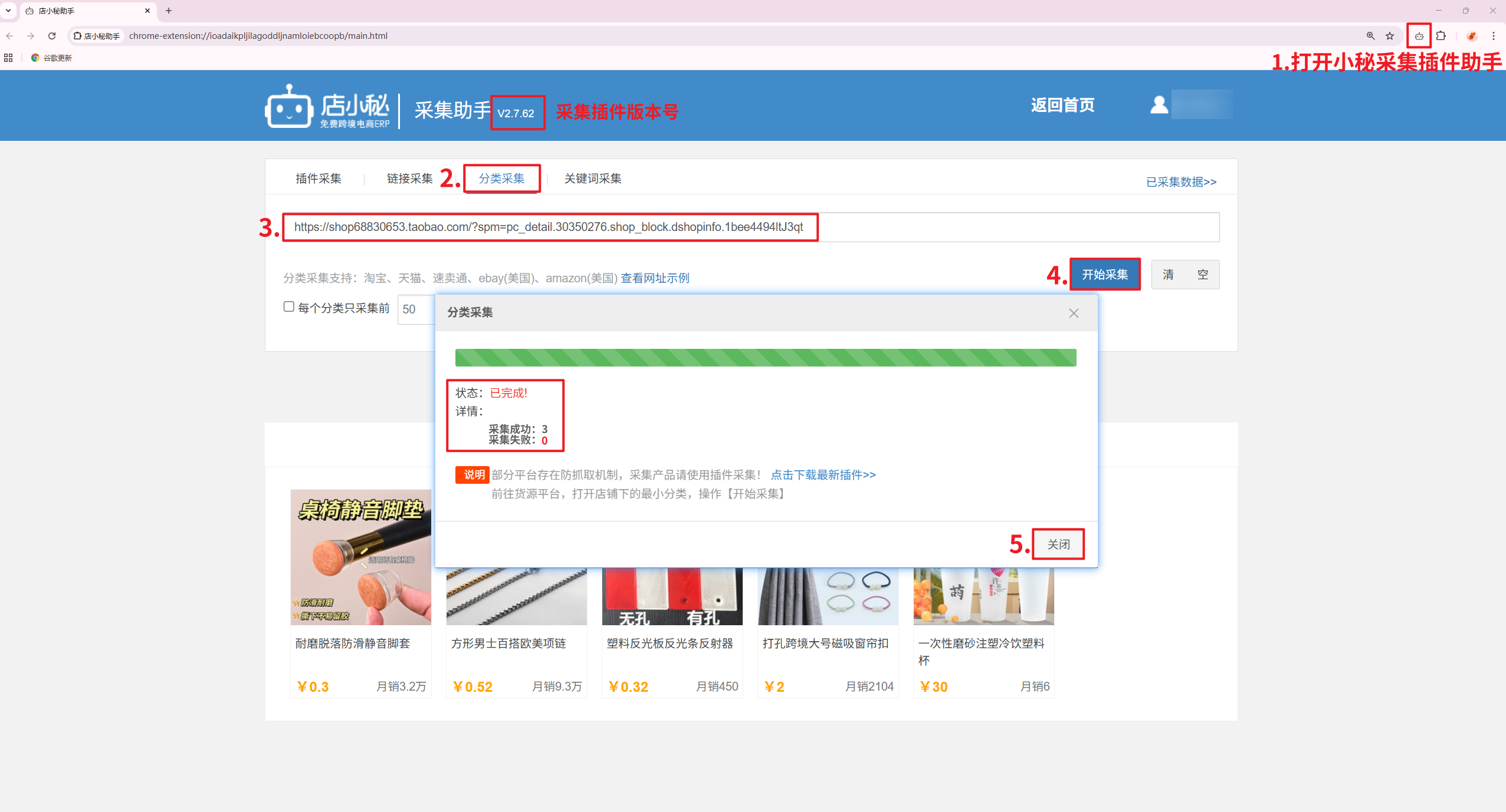 第一步:【安装采集插件—安装成功后—访问支持分类采集平台店铺内最小分类—底部点击开始采集】