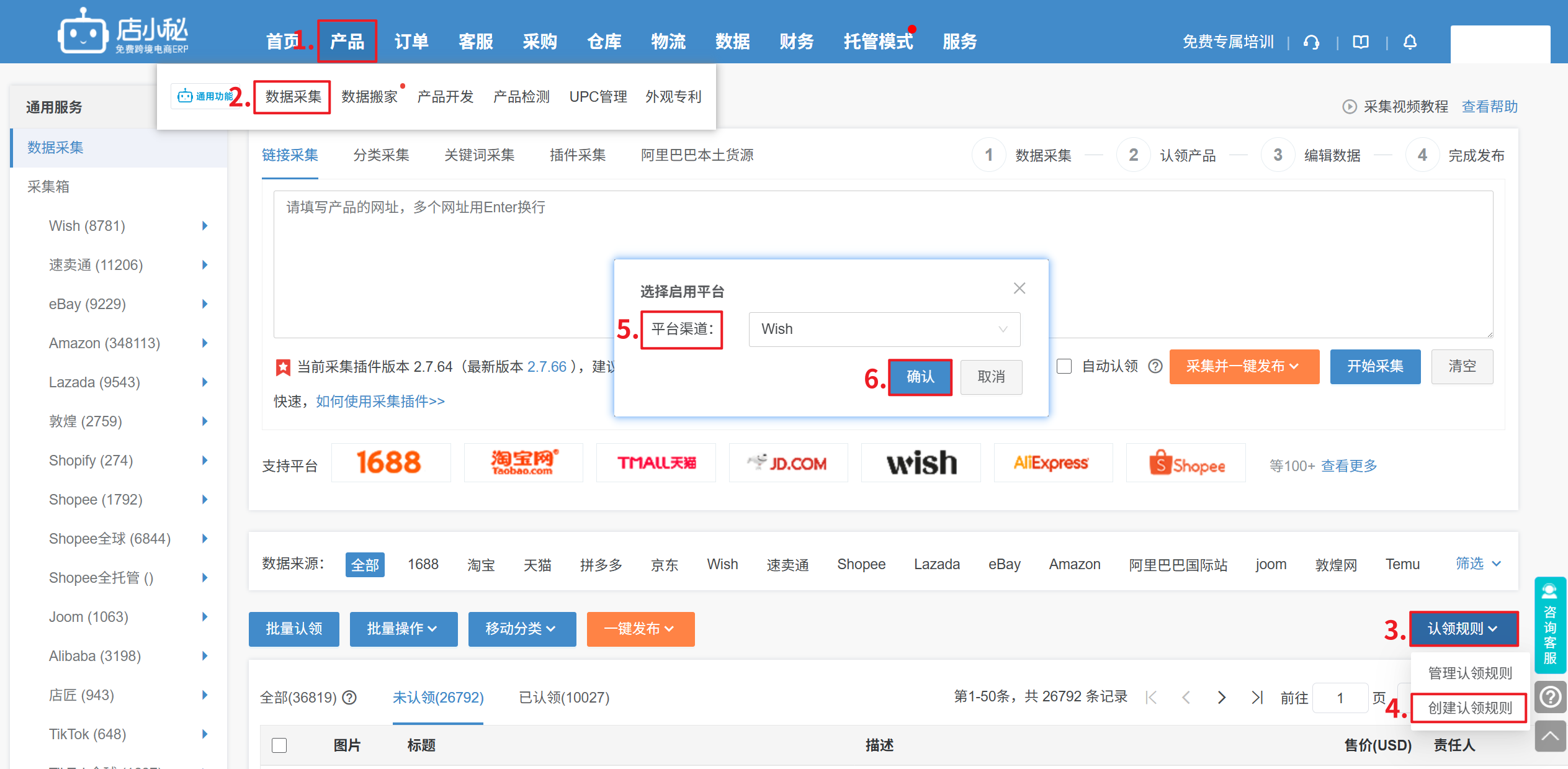 第一步:【产品—数据采集—认领规则—创建认领规则—选择Wish—确定】