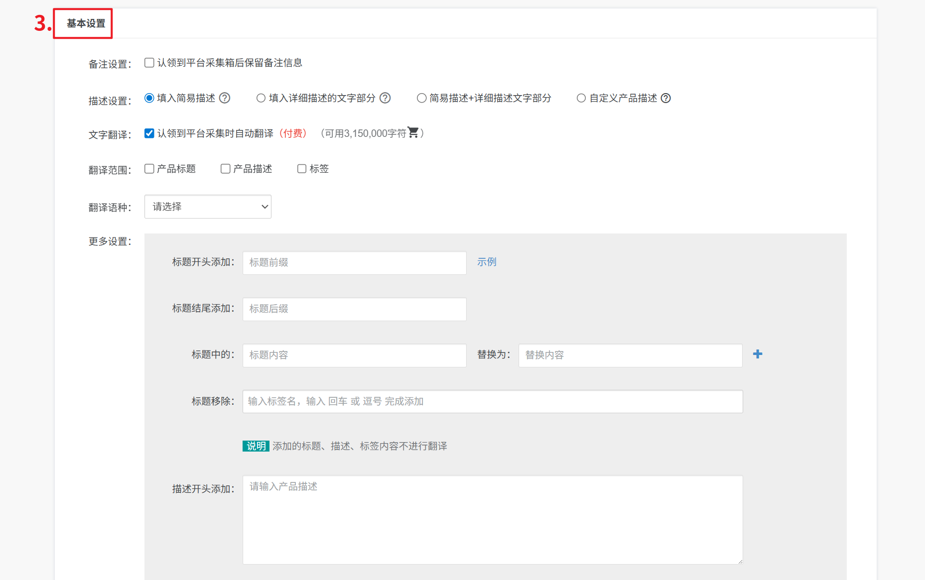 翻译范围:可选择对产品标题、描述、标签进行翻译