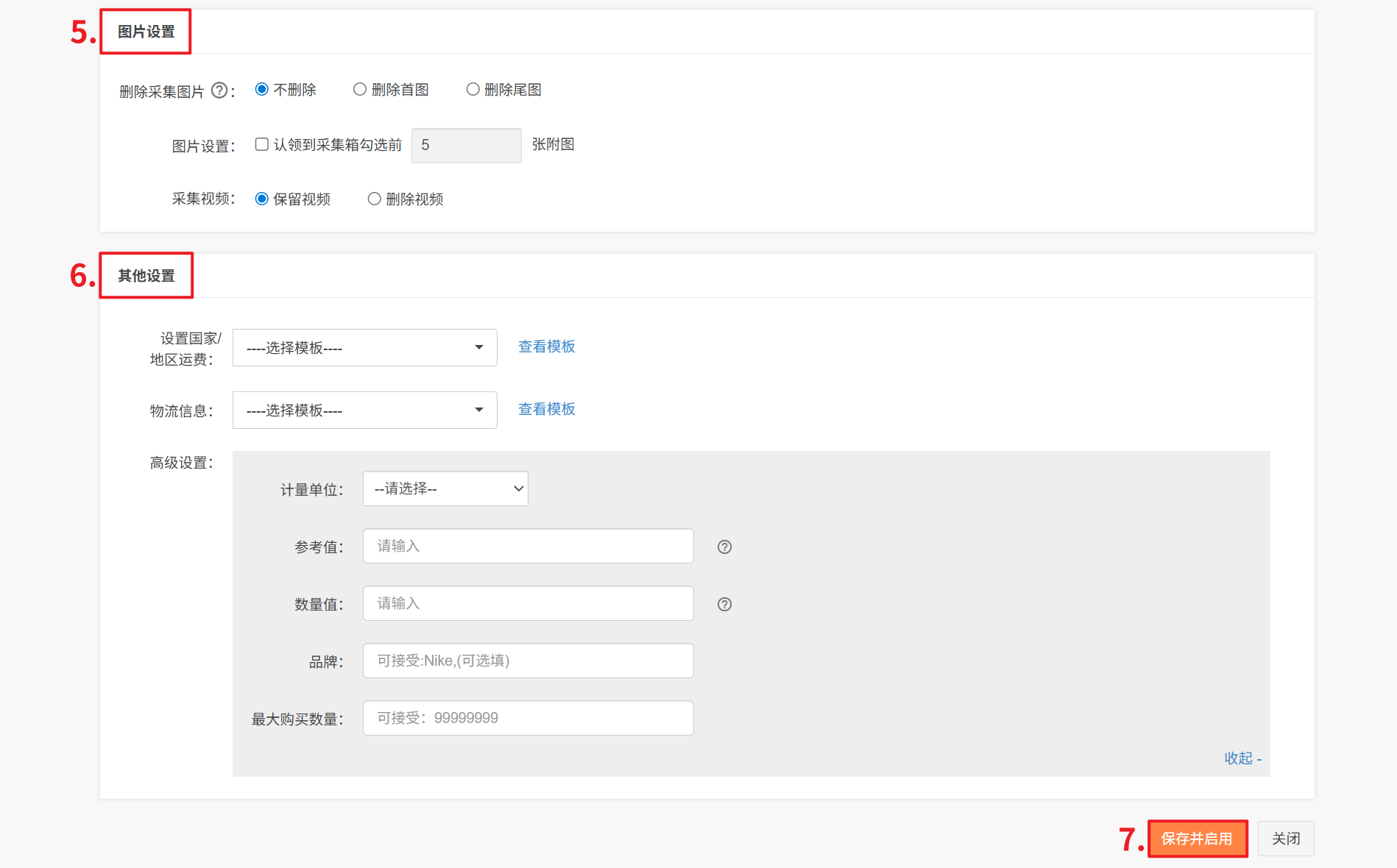 删除采集图片:可选择不删除、删除首图、删除尾图(指的产品图片)