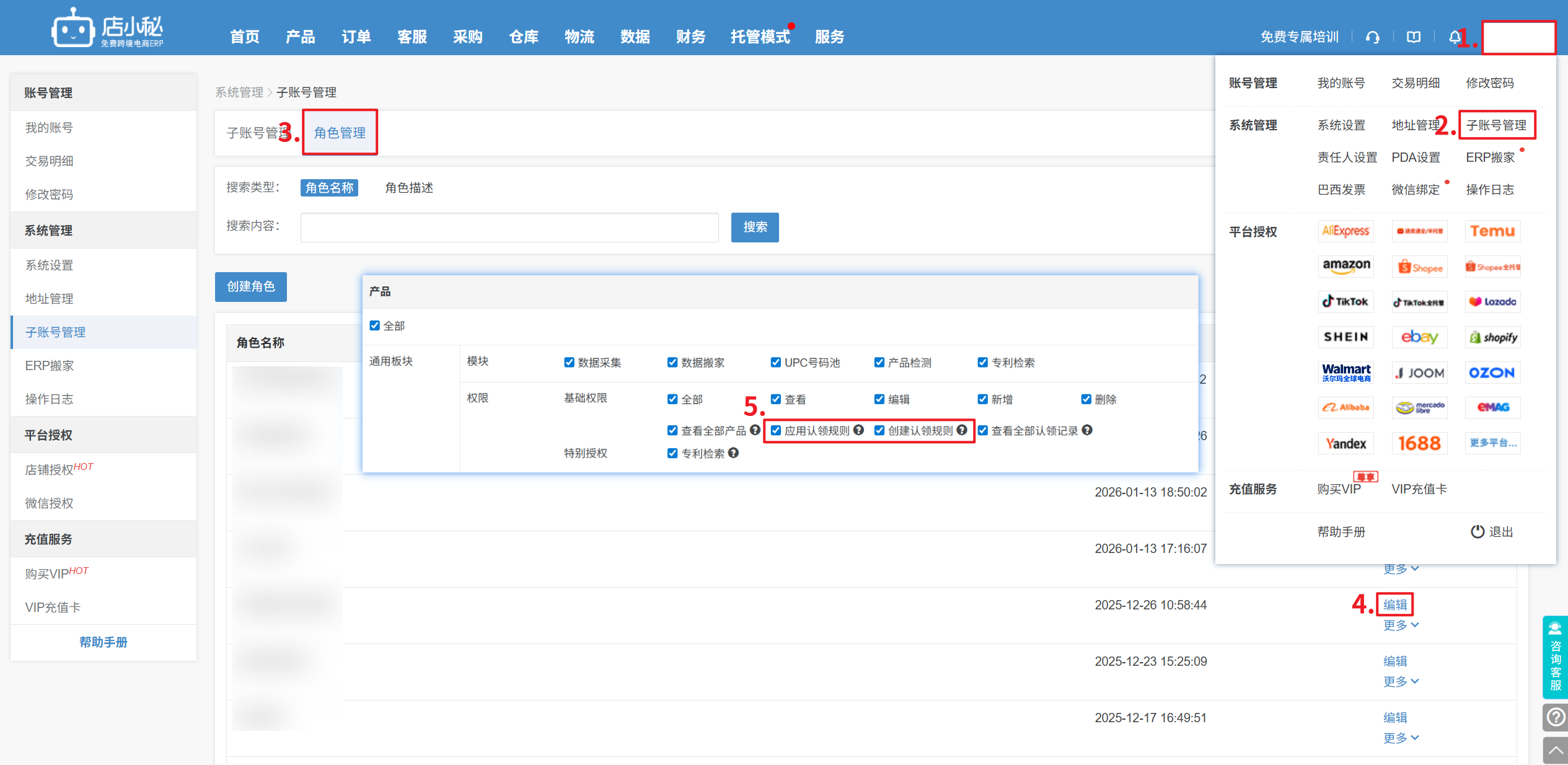 A1:【登录店小秘主账号—用户名—子账号管理—角色管理—编辑—产品模块—勾选创建/应用认领规则】才可以设置