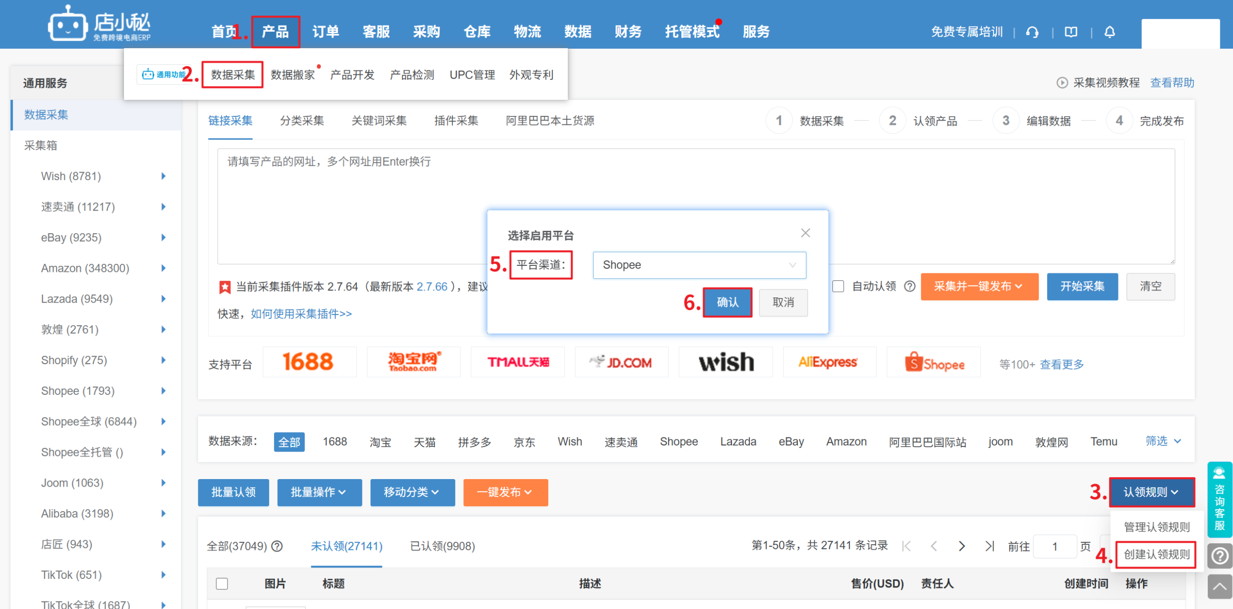 第一步:【产品—数据采集—认领规则—创建认领规则—选择Shopee—确定】