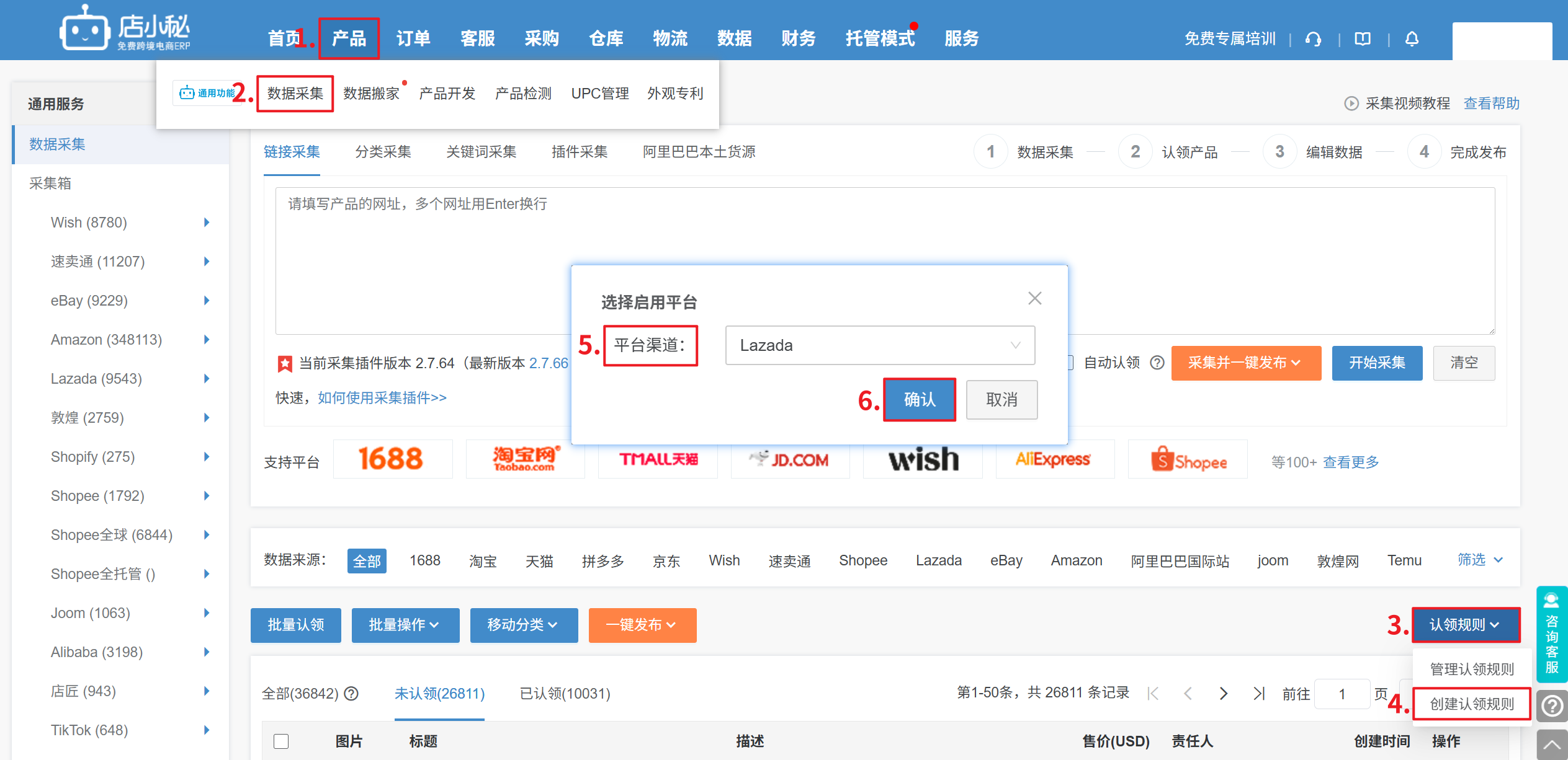 第四步:【产品—数据采集—勾选产品—单个/批量认领—选择平台/店铺(店铺名称后面会显示启用规则的标识)—确定
