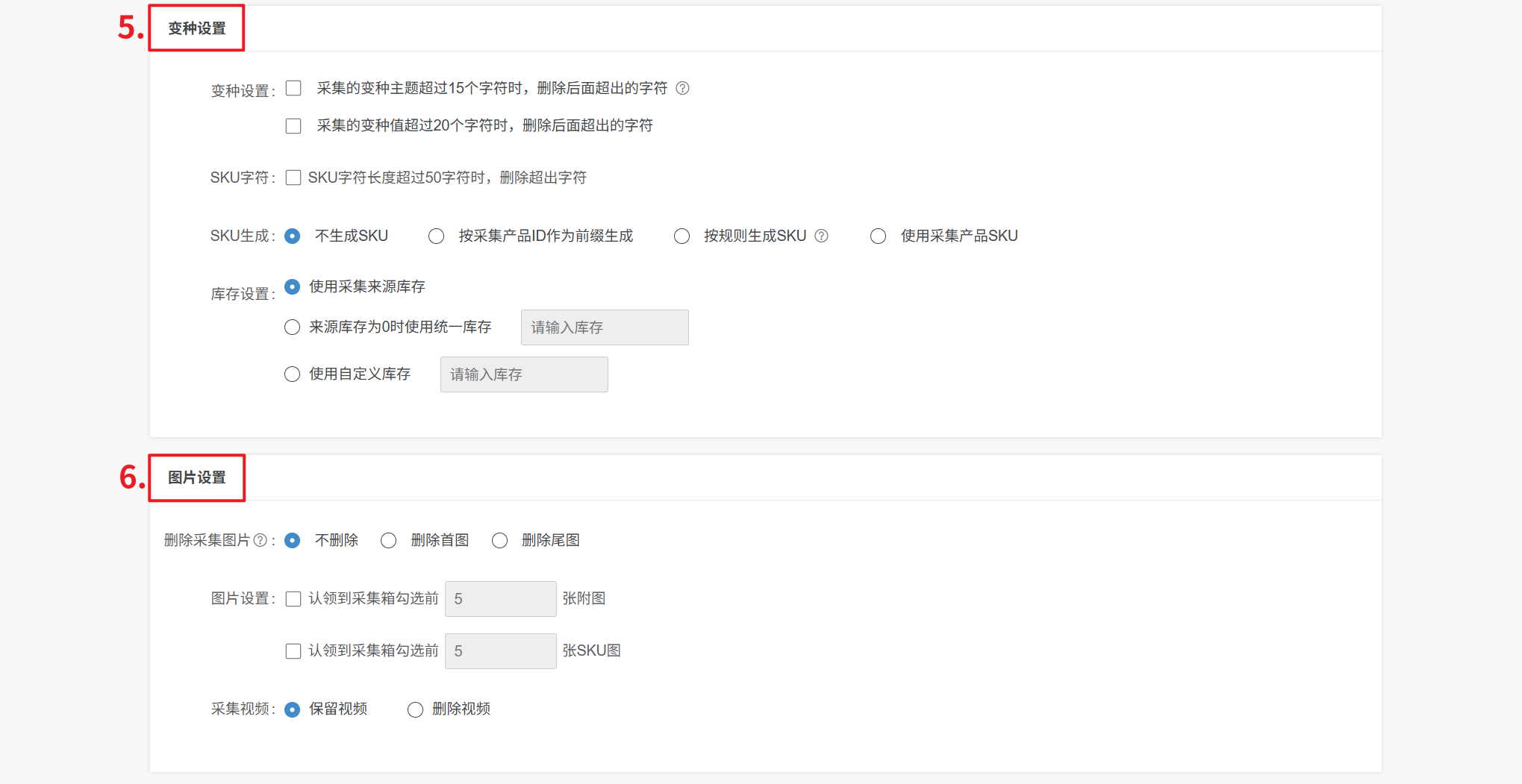 删除采集图片:可选择不删除、删除首图、删除尾图(指的产品图片)