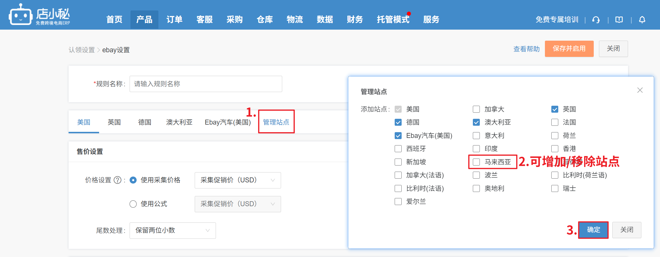 8、保存并启用:勾选店铺后,点击确认, 后续从通用采集箱认领到eBay的产品,就会按认领规则修改