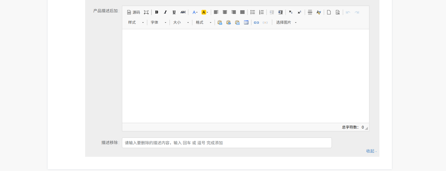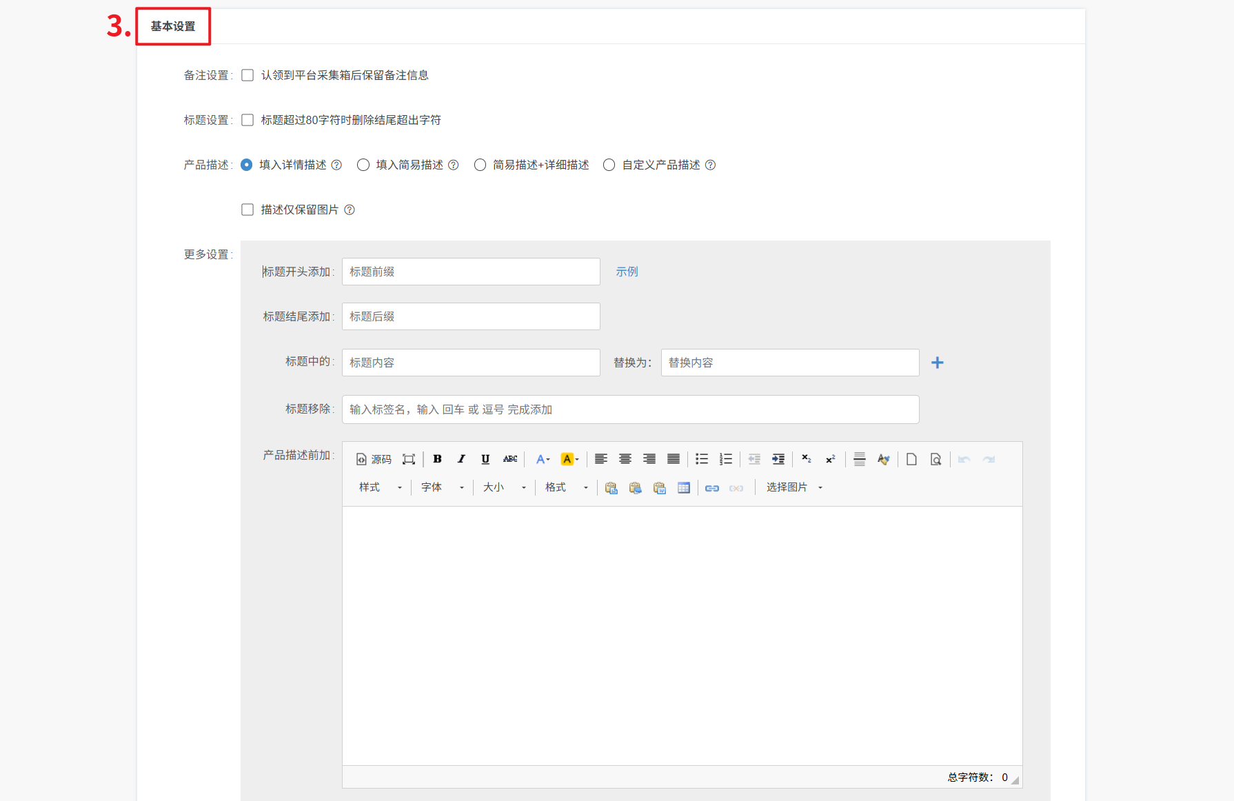 ⑤ 选择自定义产品描述,将不填充采集产品的描述,需要自定义设置描述内容