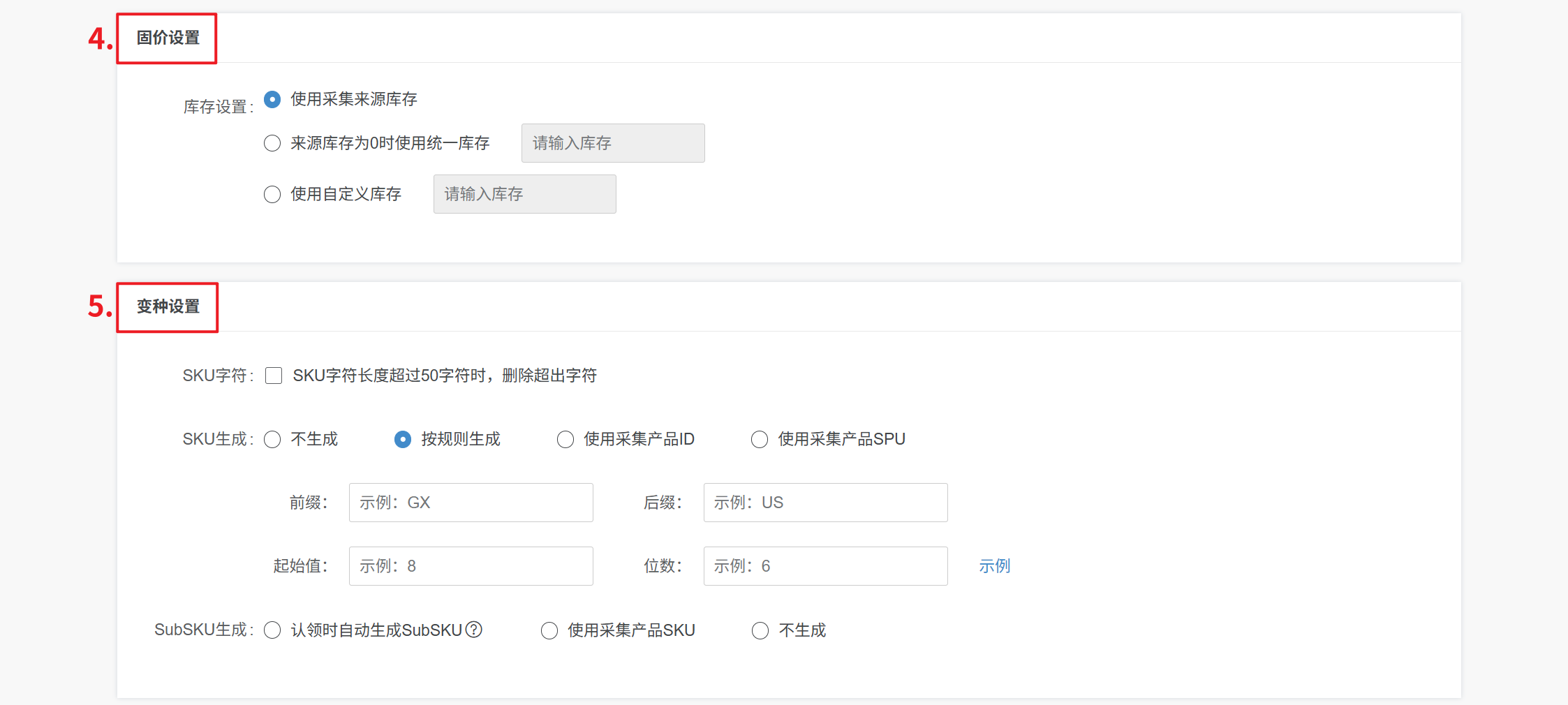 ④ 按采集产品SPU作为前缀生成:按【产品SPU+变种属性名称】生成SKU/SubSKU
