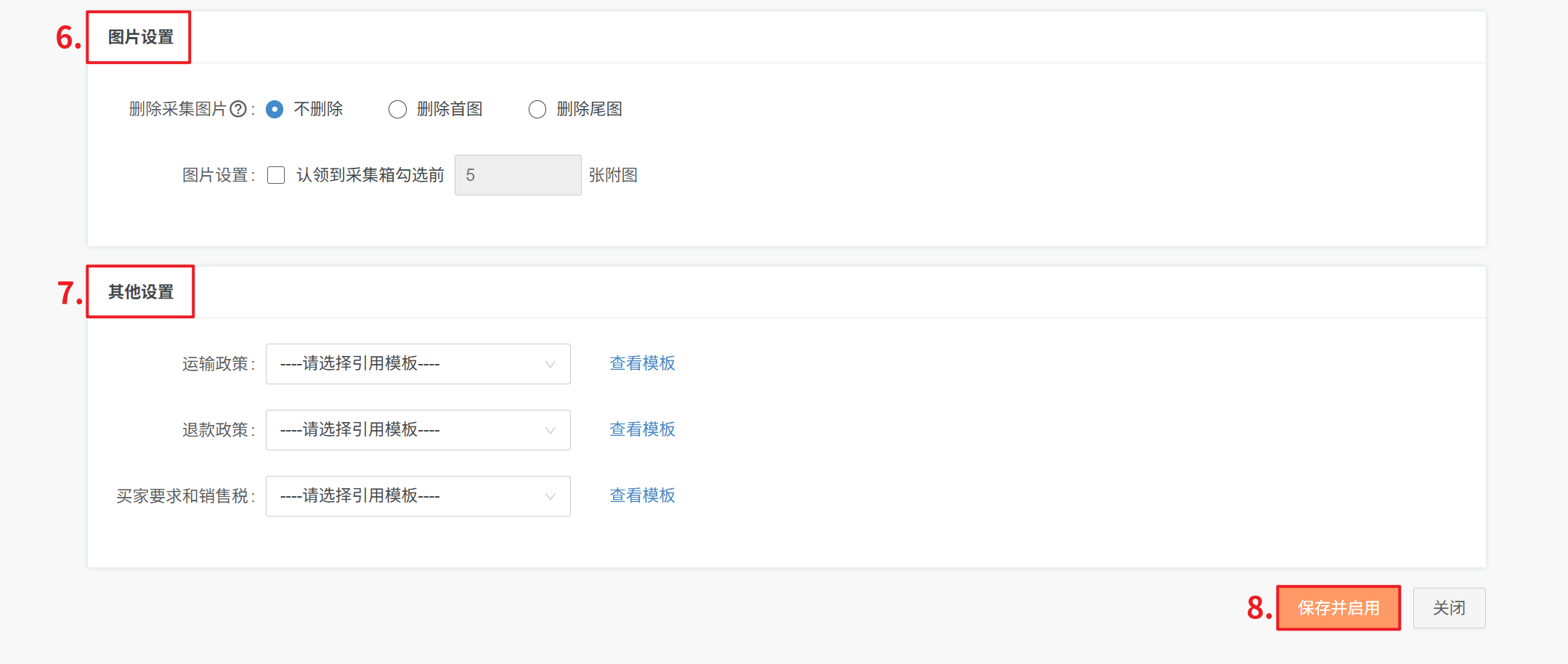 删除采集图片:可选择不删除、删除首图、删除尾图(指的产品图片)