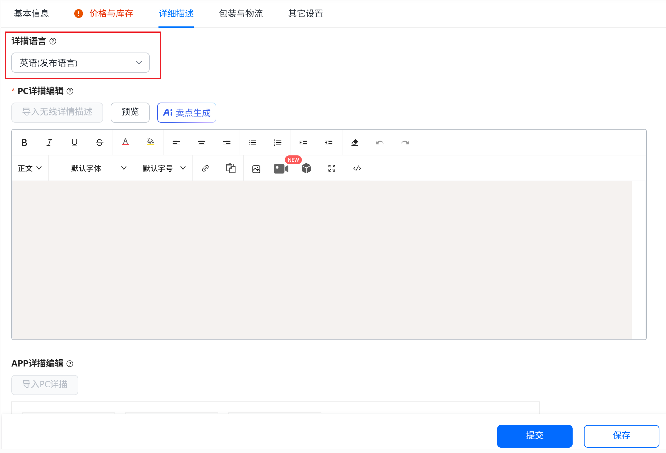 原因:速卖通后台设置了多语种描述,目前店小秘只对接了英文的PC端描述,创建/更新都只能和英文的描述去对应生效 解决方案:1、如果只设置了英文的描述,那更新就完全正常2、如果除了英文,还另外设置了其他语言的描述,比如俄语的 通过小秘页面修改,只能改英文的描述,俄语的描述,只能到速卖通后台去单独更新3、如果只设置了其他语言的描述,比如俄语的,没有设置英文 那通过小秘页面无法更新,只能到速卖通后台操作