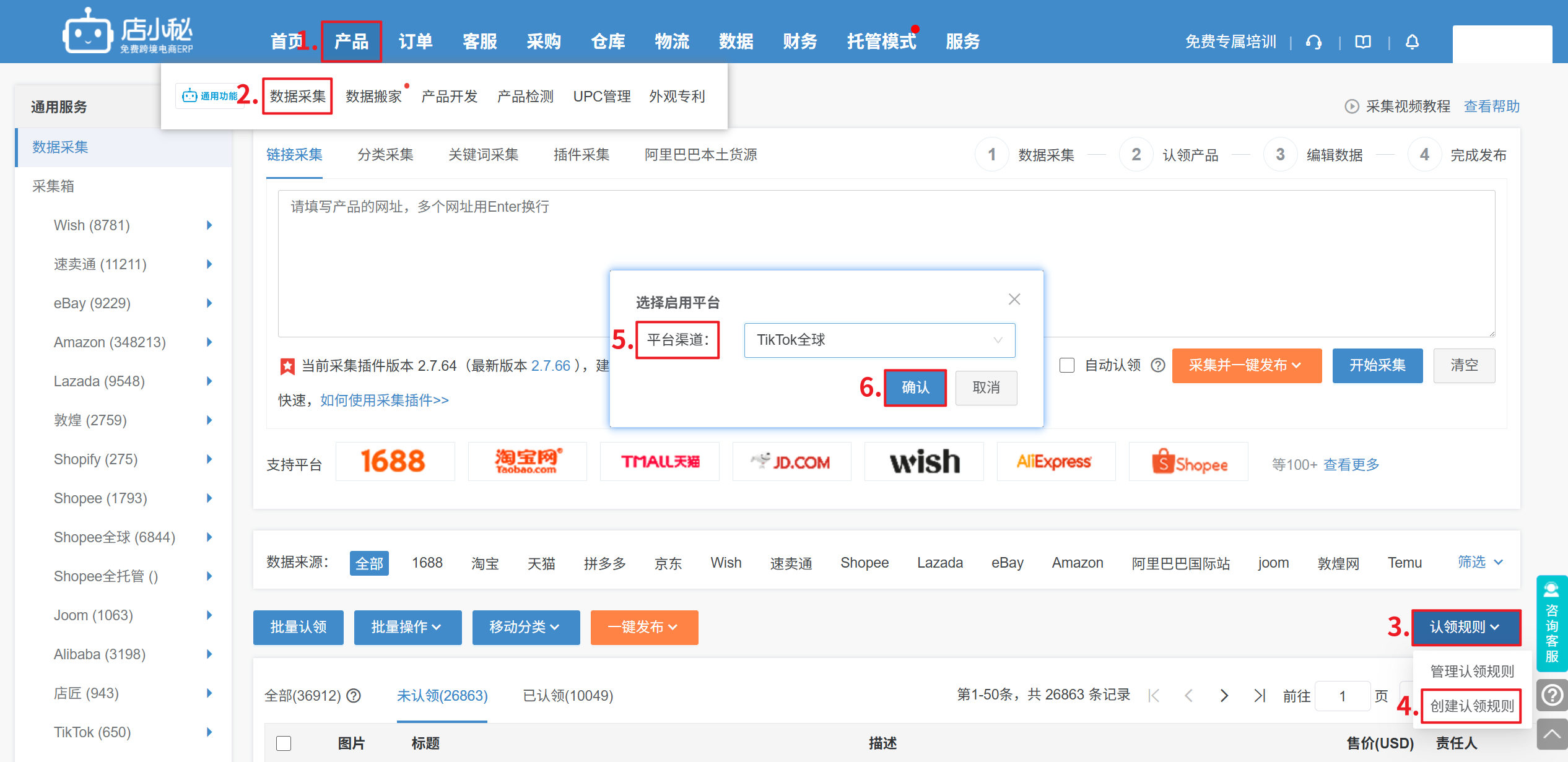 第一步:【产品—数据采集—认领规则—创建认领规则—选择TikTok全球—确定】