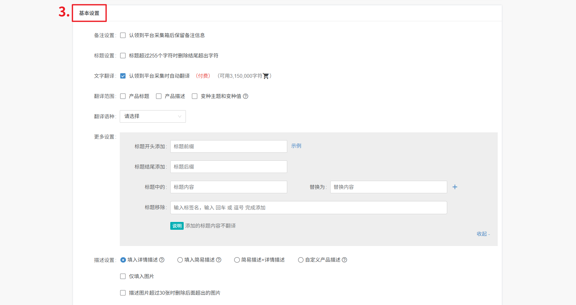 更多设置:选择填入详情描述/简易描述/简易描述+详情描述,可针对描述开头/结尾、移除描述内容