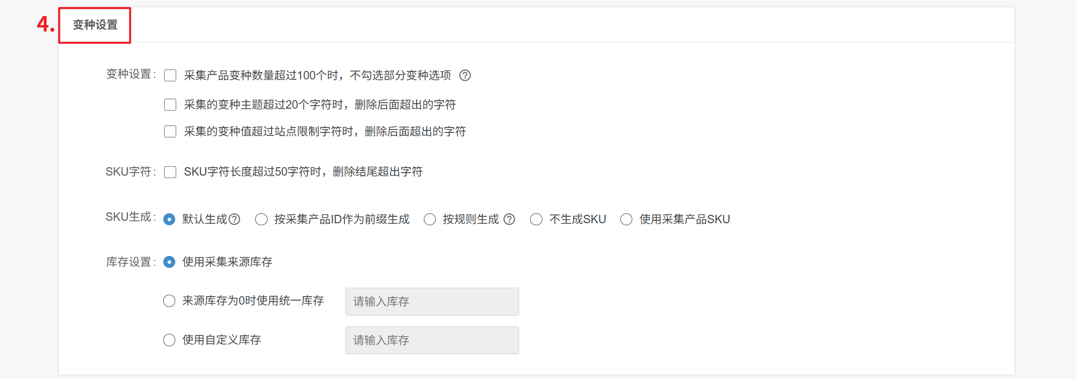 变种设置:① 可设置采集变种数量超过100时,不勾选部分变种属性