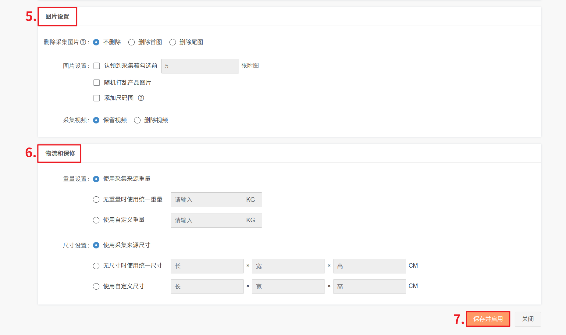 图片设置:认领到采集箱自定义保留前几张附图,可随机打乱图片顺序、添加尺码图