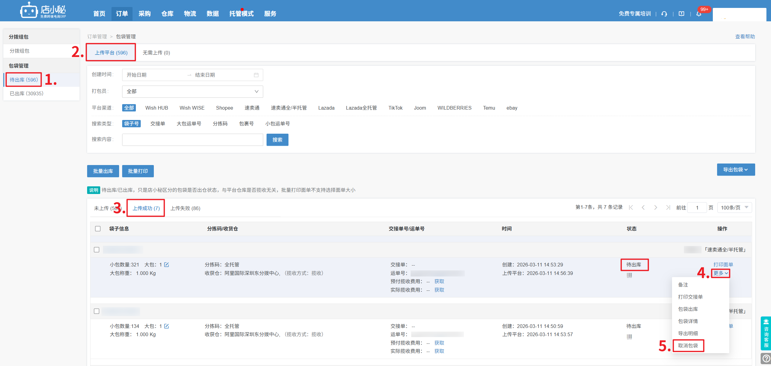 A6:可以的,待出库状态—点击更多—取消包袋,取消后包袋会进入未上传状态,可重新上传平台