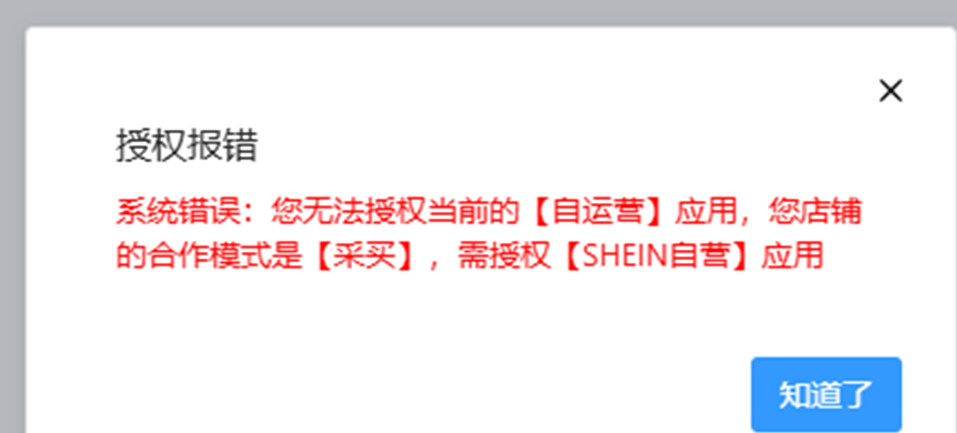 Q13:Shein授权报错系统错误:您无法授权当前的[自运营]应用,您店铺的合作模式是[采买],需授权[SHEIN自营]应用