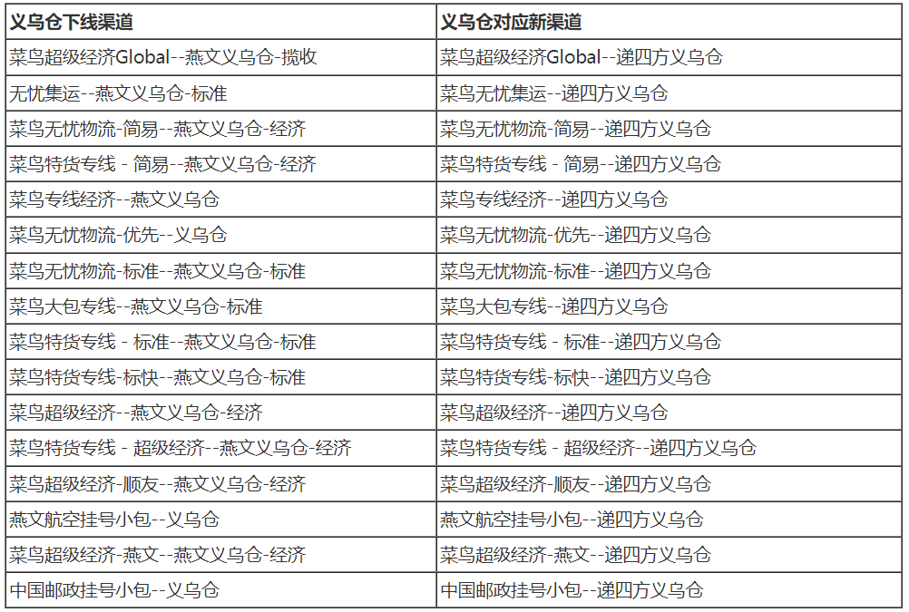 A1:涉及调整的是之前揽收仓为“燕文义乌仓”相关渠道哈,目前切换成递四方对应仓库