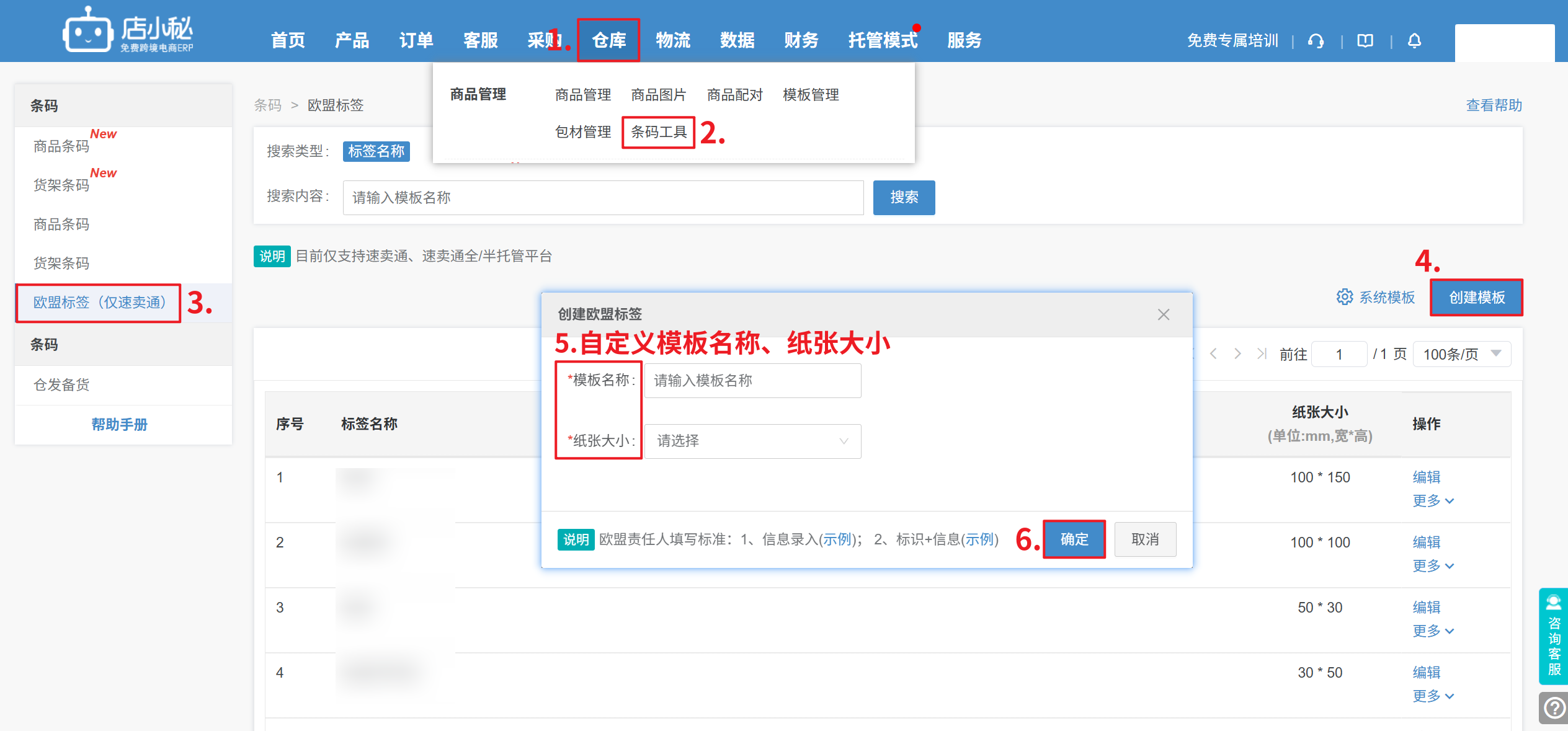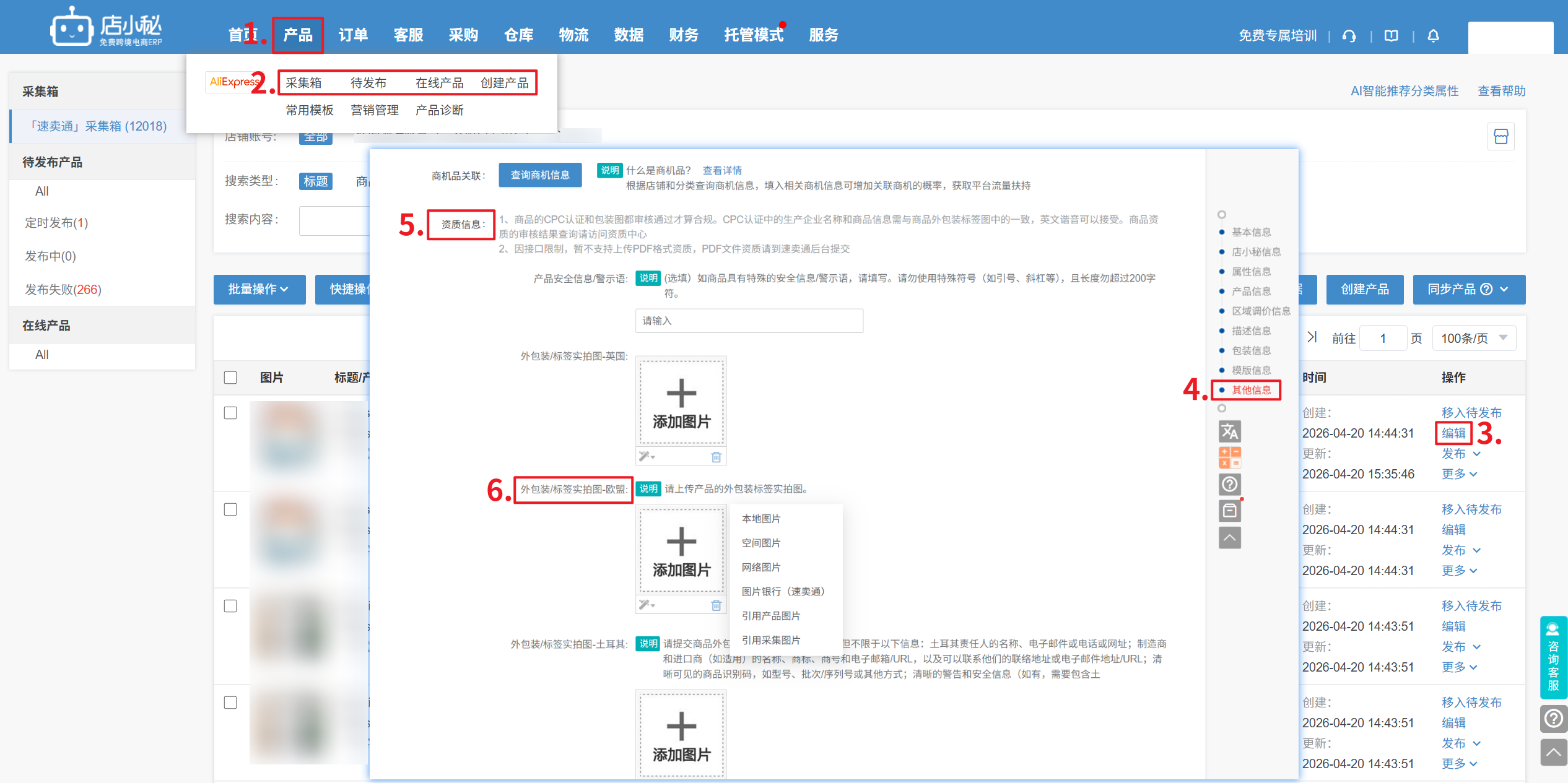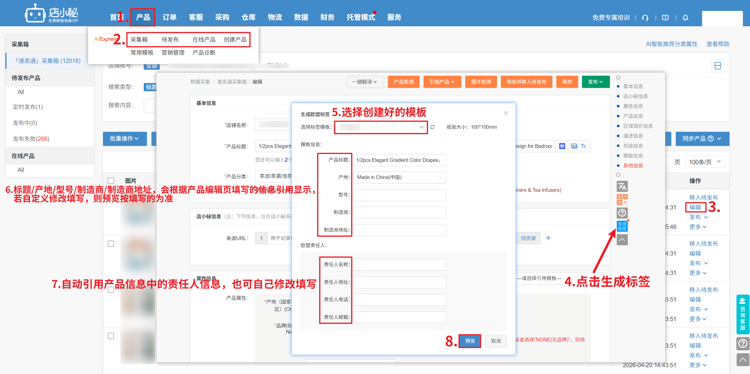 第一步:【产品—采集箱/待发布/在线产品/创建产品—编辑页面生成标签—选择打印模板—自定义填写生成信息—预览打印】