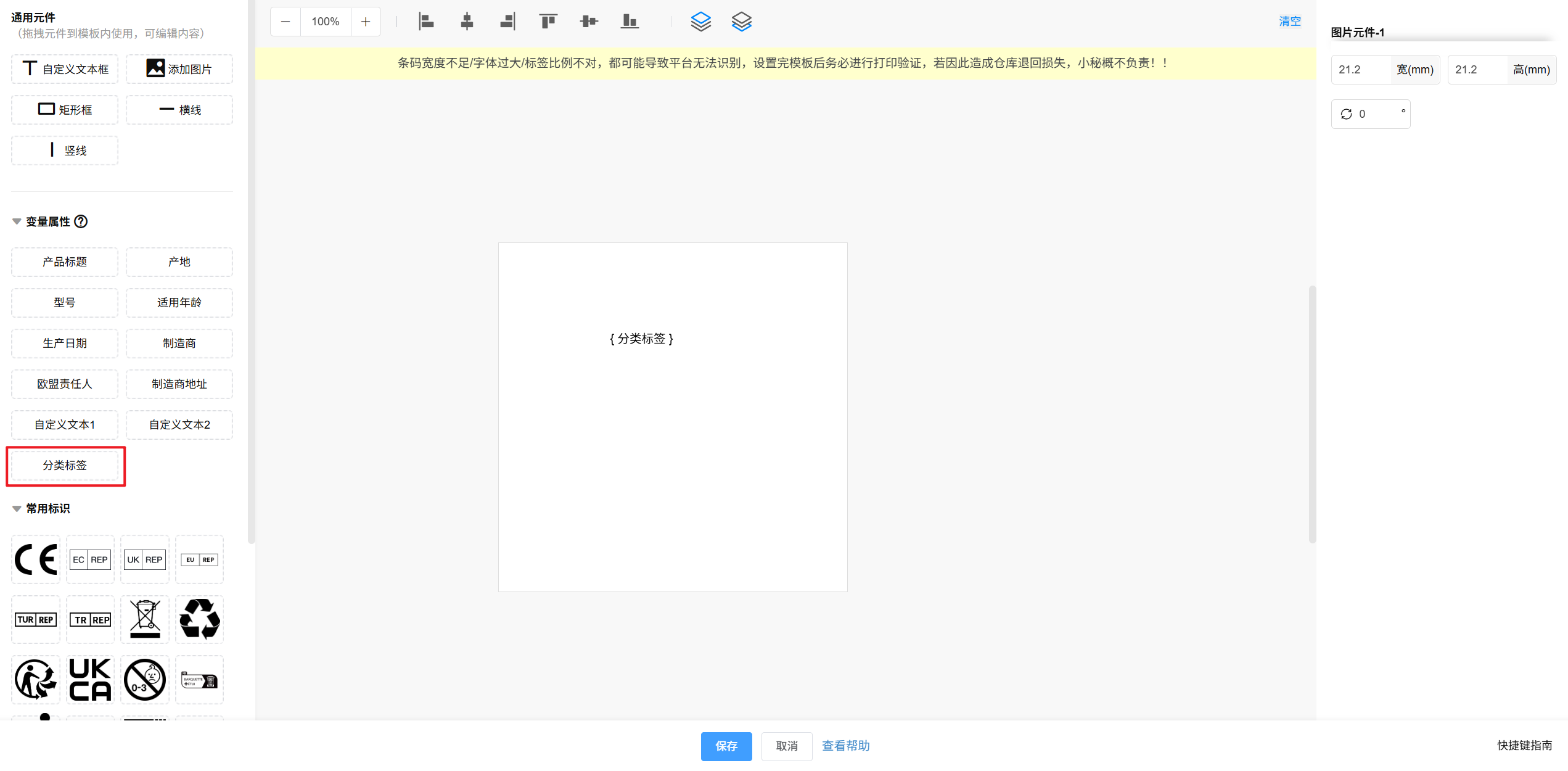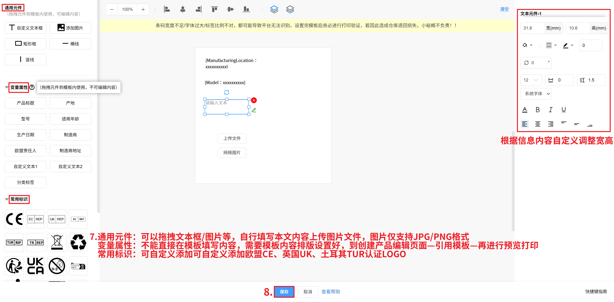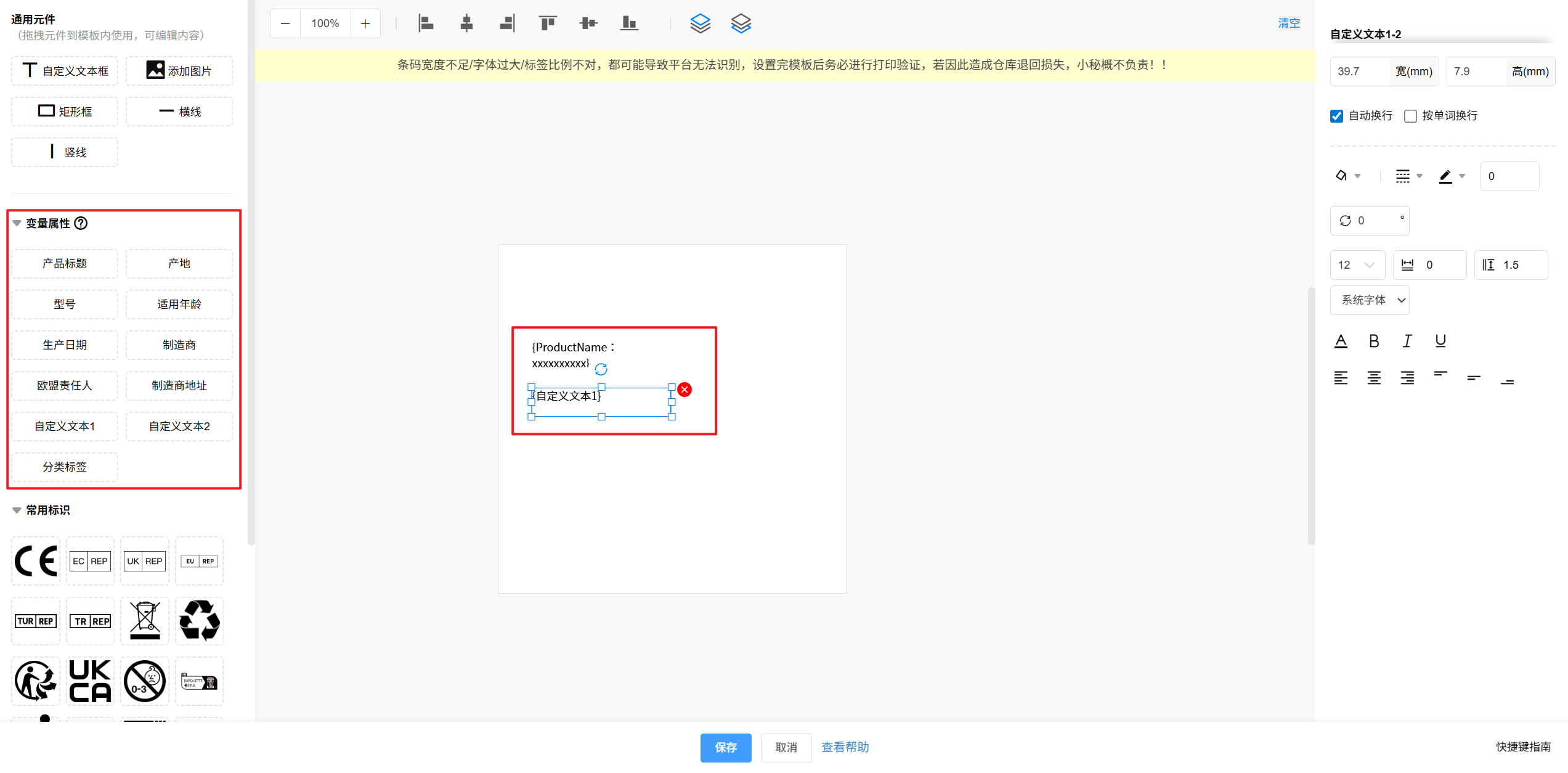 第二步:【选择要打印的自定义属性信息/常用标识—根据信息内容长短—自定义设置宽高尺寸显示—保存】