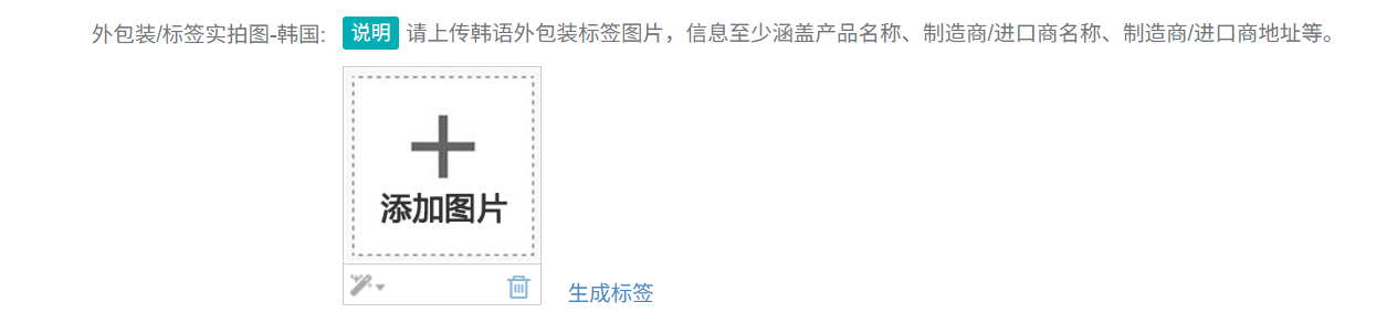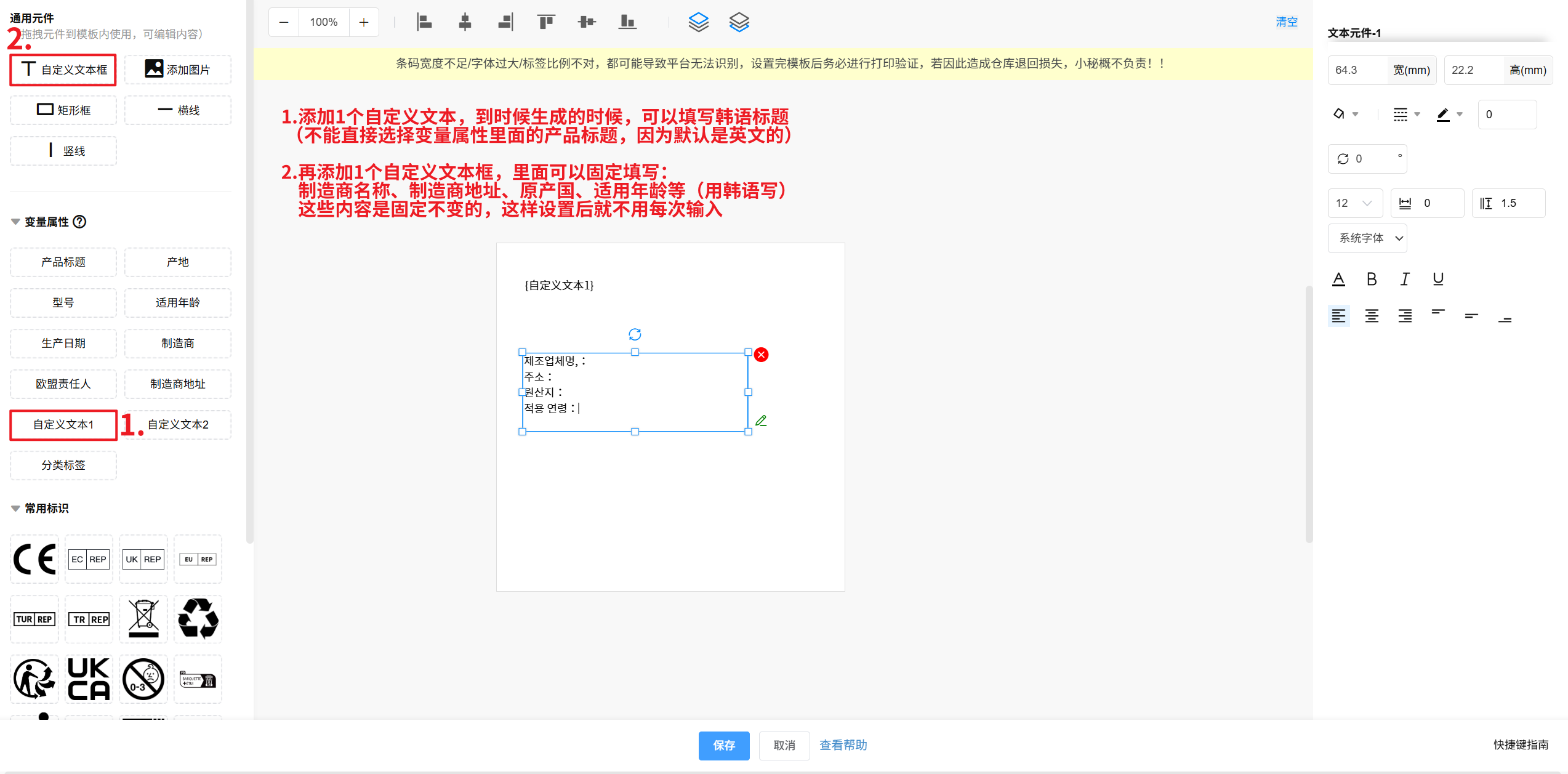 2、再添加1个自定义文本框,里面用韩语固定输入:制造商名称、地址、原产国、适用年龄等信息