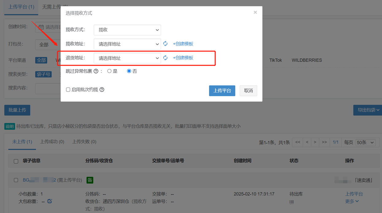 4、收货仓、揽收方式要选择订单选择的物流渠道对应的仓库和揽收方式