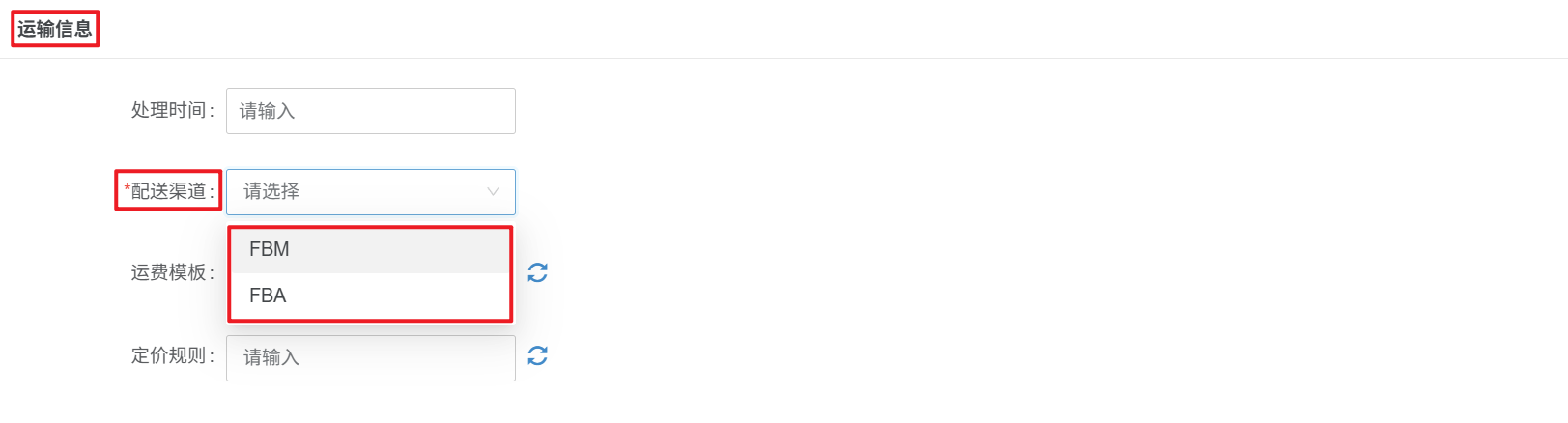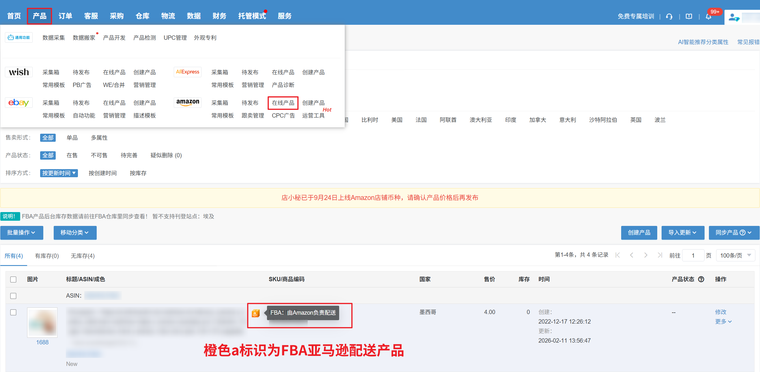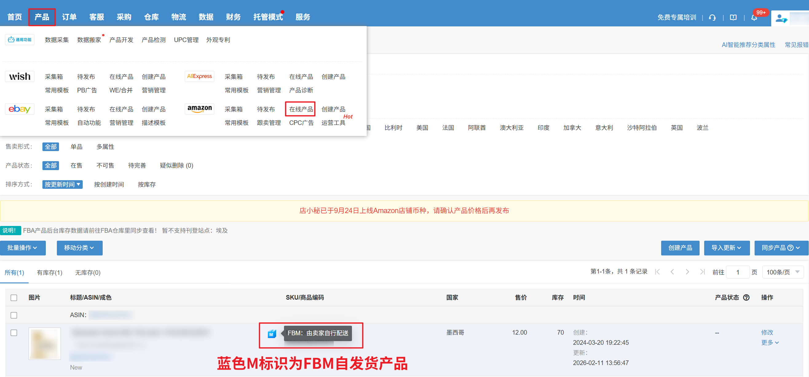 FBA产品标识如下图:注意事项:1、亚马逊新版到运输信息—配送渠道分别选择FBM或FBA可以发布FBM和FBA的产品2、在线产品页面,FBA产品库存默认显示为0,实际库存可在【仓库—FBA货件(STA)—FBA补货—同步FBA】后查看