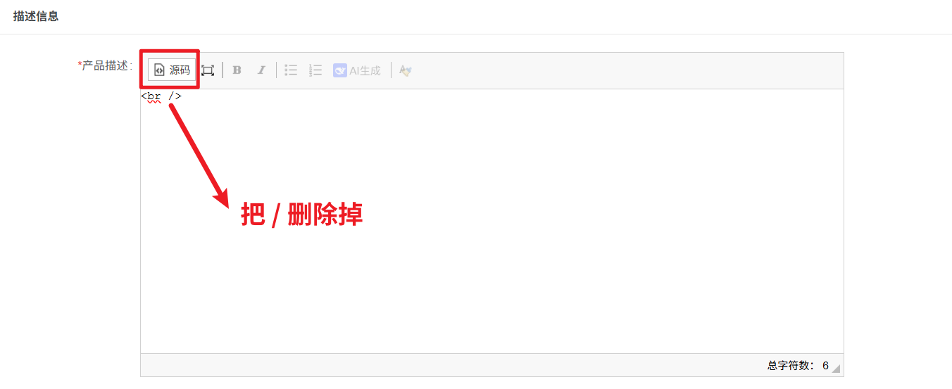 描述信息点击切换源码,改一下换行符,把/符号删除掉