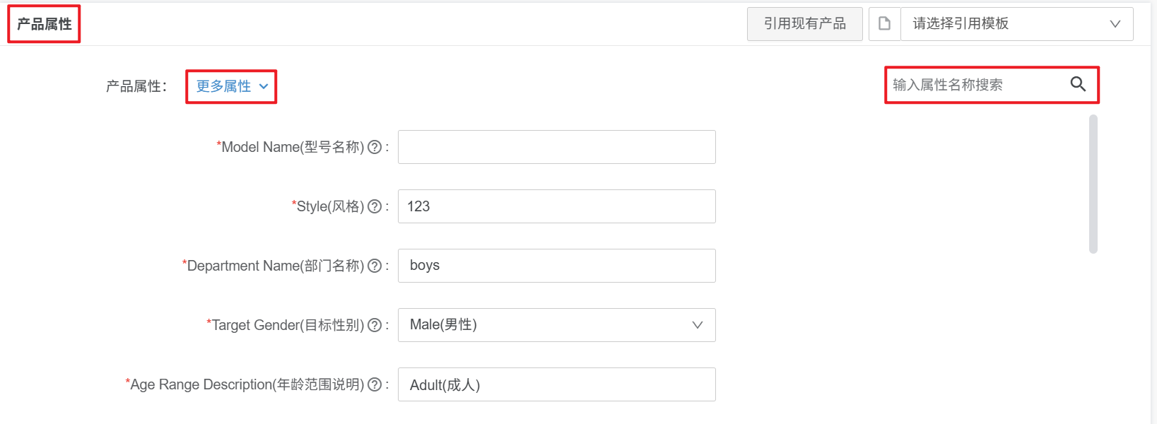 在产品编辑页面点击【更多属性】搜索 Missing Attributes后面的单词(图中:color), 不要带有符号,搜索出来后再完善该属性再发布
