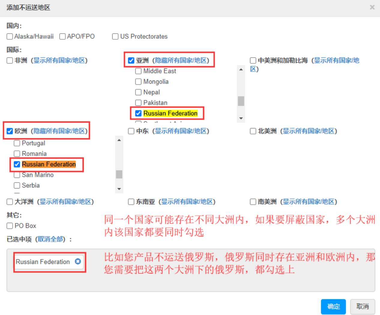 比如:1、Russian Federation(俄罗斯)同时存在亚洲和欧洲下,如果需要设置不运送,需要同时勾选