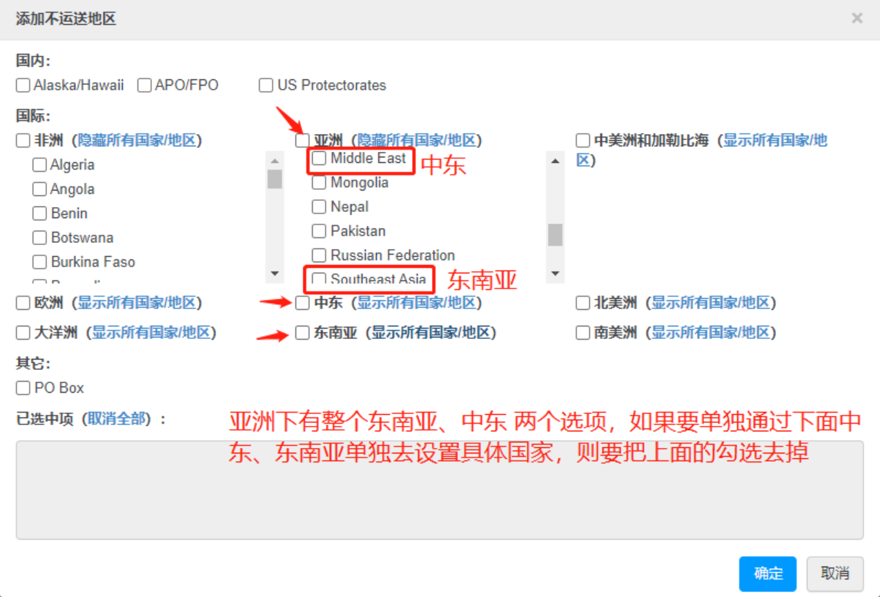 A1:不运送地区,亚洲有包含中东和东南亚两个选项,如果要单独对中东和东南亚去设置具体国家,