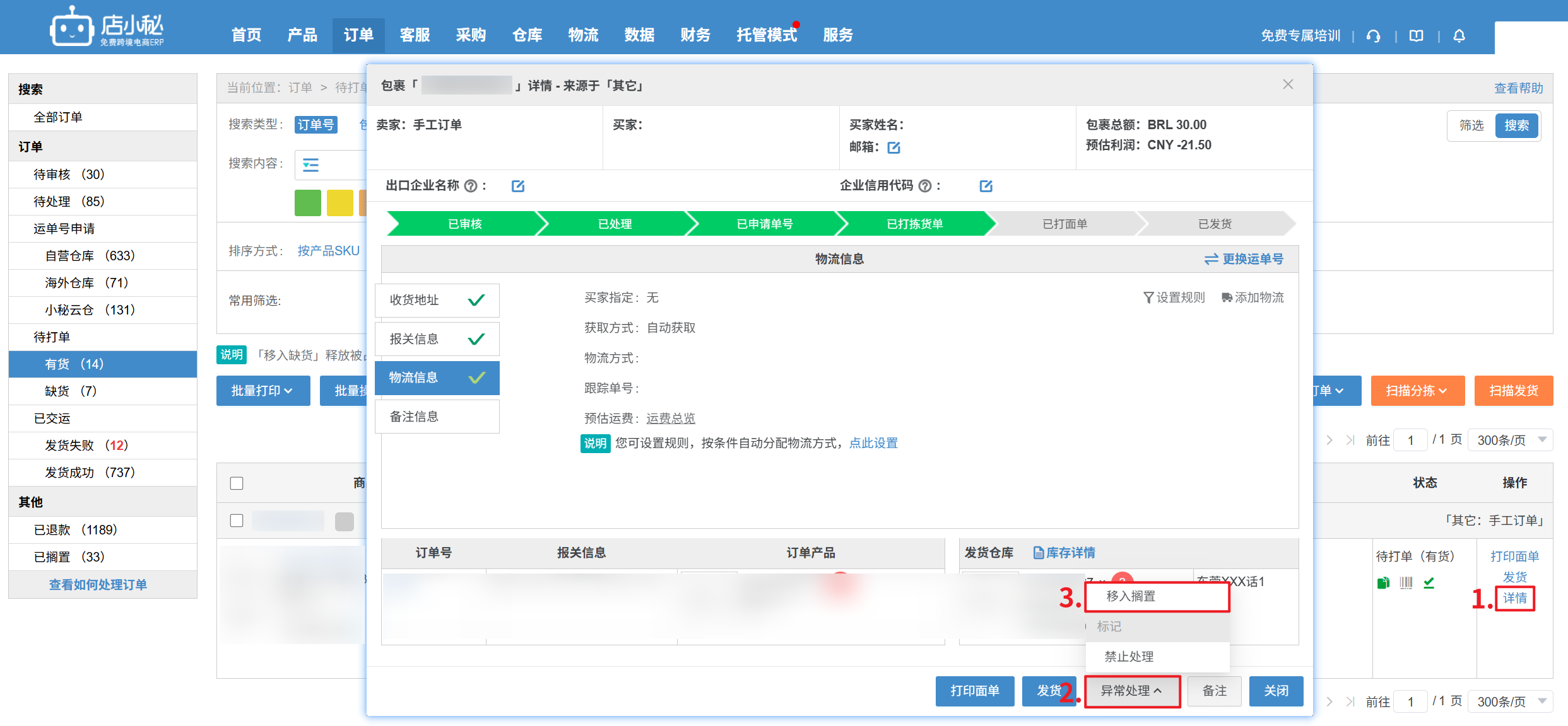 3、提交发货成功后,小秘页面可以【点击详情—异常处理—移入搁置】或点击蓝色字体【移入已交运】