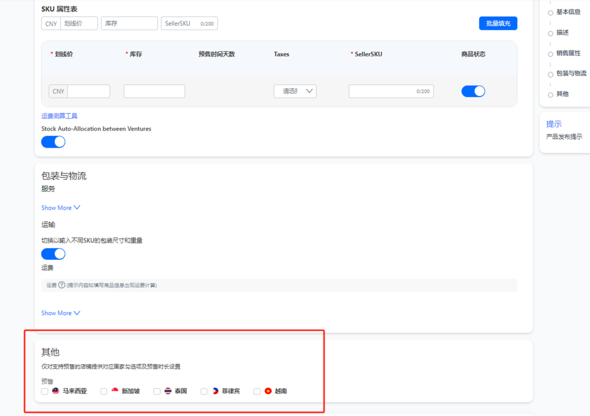 Q9:Lazada六合一发布为什么无法设置预售,单个站点才能设置,后台是可以的?