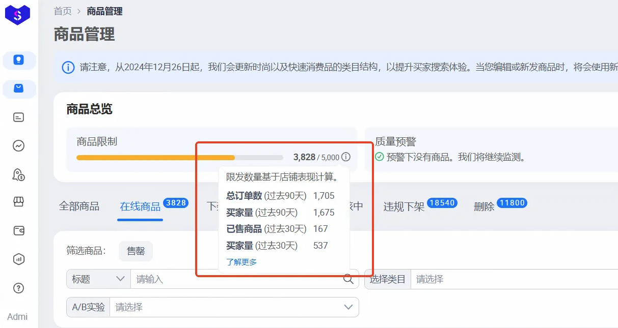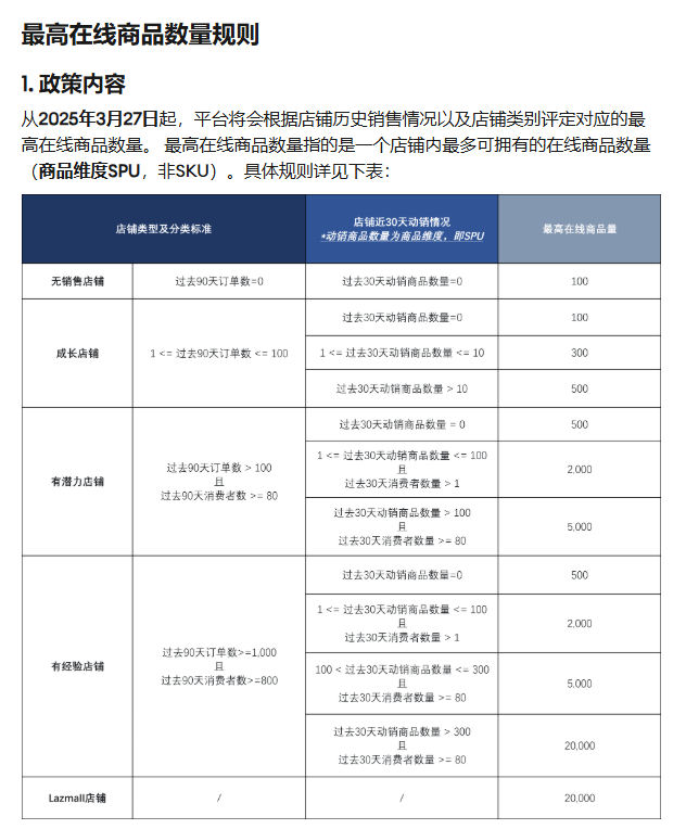 原因:Lazada平台会根据店铺过去90天(自然日)的动销商品数量、店铺取消率 及不同买家数量对店铺最高在线商品数量进行升级或降级解决方案:1、ASC店铺:可以到Lazada店铺后台—商品管理—商品总览—商品限制查看商品数量限制额度2、GSP店铺:可以到卖家中心—商品管理—添加产品,通过切换站点查看各个站点的商品数量限制额度Lazada平台最高在线商品数量详细规则请 点此查看