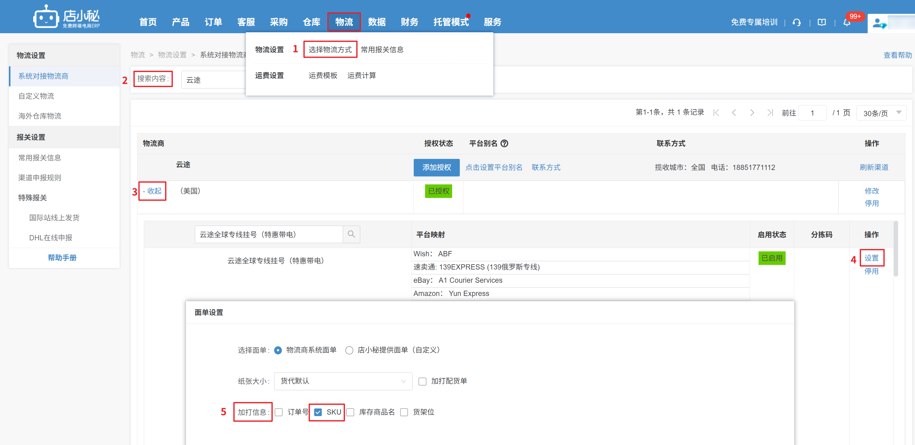 物流—选择物流方式—找到订单选择的渠道—设置—勾选加打SKU—保存—然后订单页面重新申请运单号即可