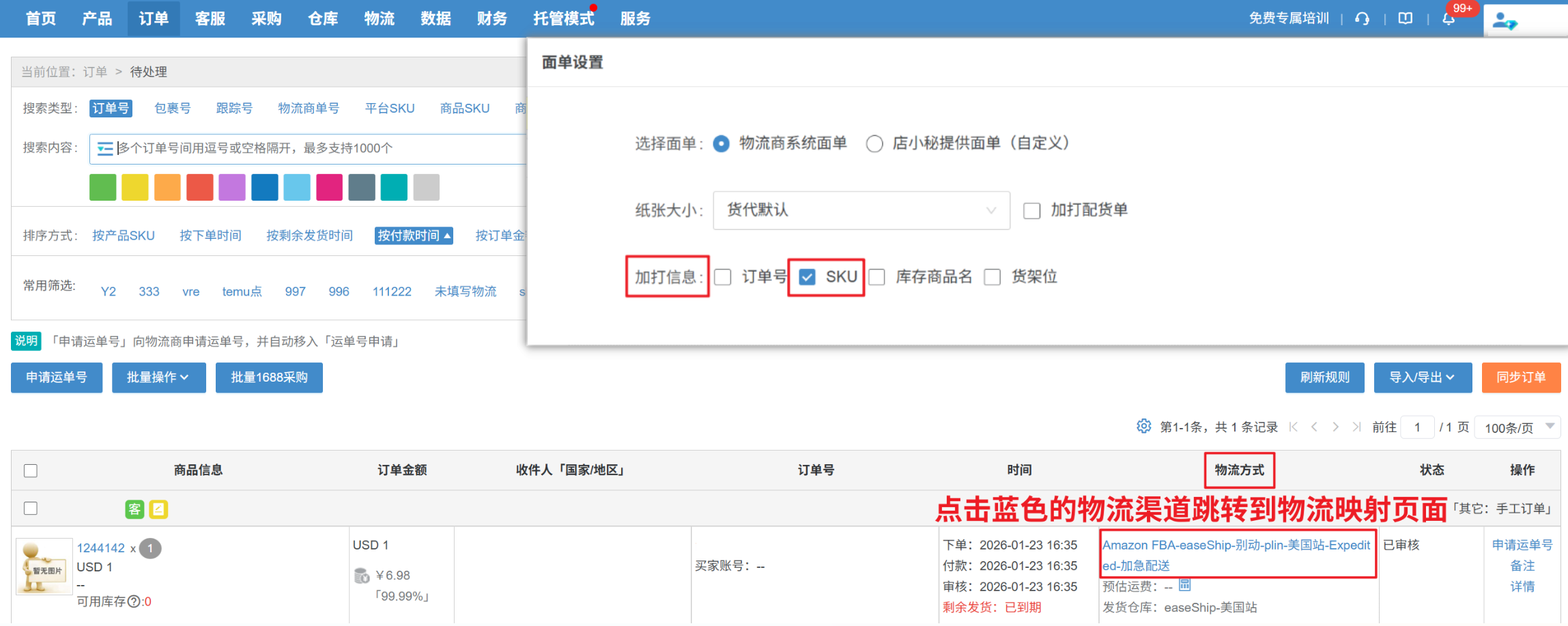 订单—物流方式—点蓝色物流渠道跳转到物流设置—勾选加打SKU—保存—重新获取运单号即可