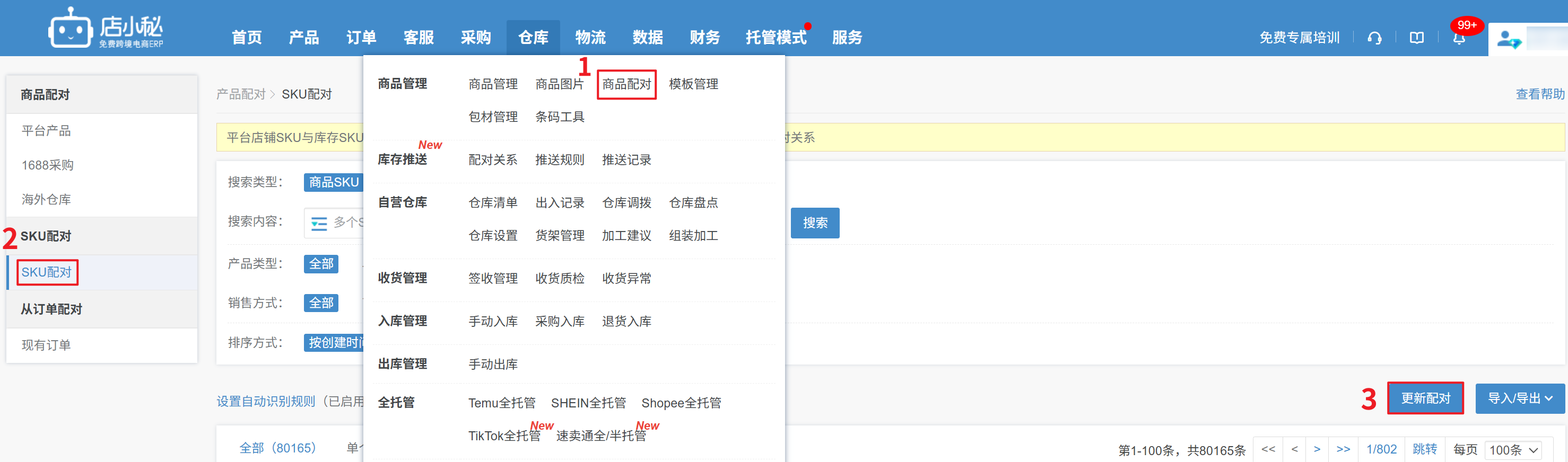【仓库—商品配对—SKU配对—更新配对,现有的待审核、待处理订单会自动匹配商品SKU】